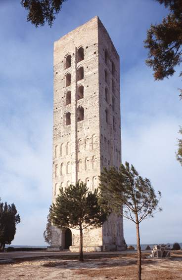 Su mitad baja está decorada con arcos dobles ciegos de medio punto y, en la parte superior, hay cuatro pisos con dobles ventanales.