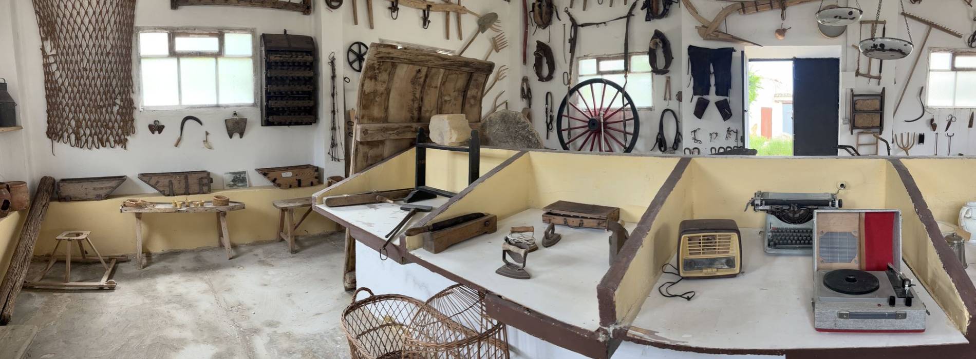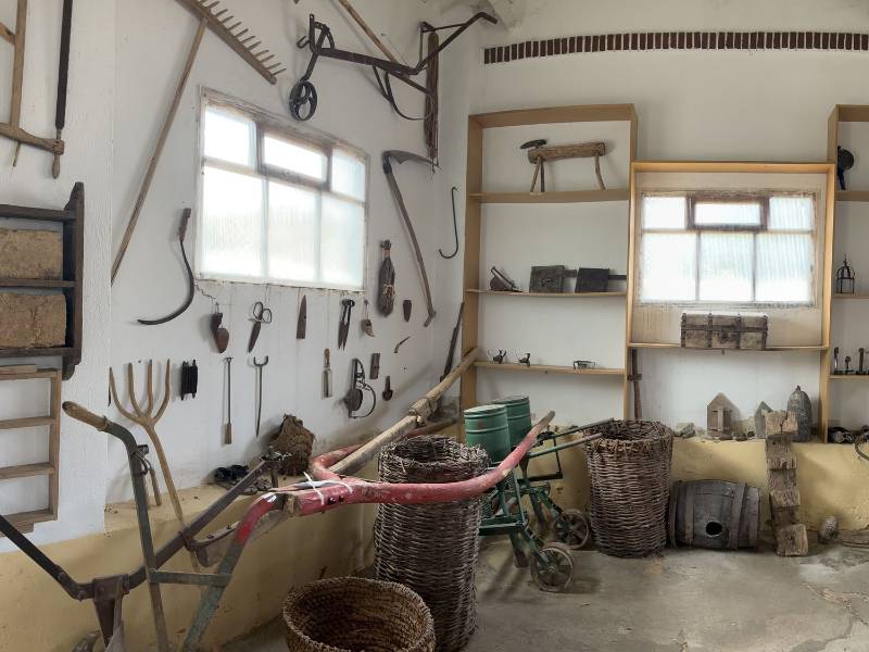 Muestra un arado romano, trillo, vieldas, medias fanegas, arreos del ganado, utensilios y herramientas para la elaboración del queso y vino; aparatos de medida, piedras de molino, enseres de una casa de labranza y material y mobiliario de un escudo de la época.