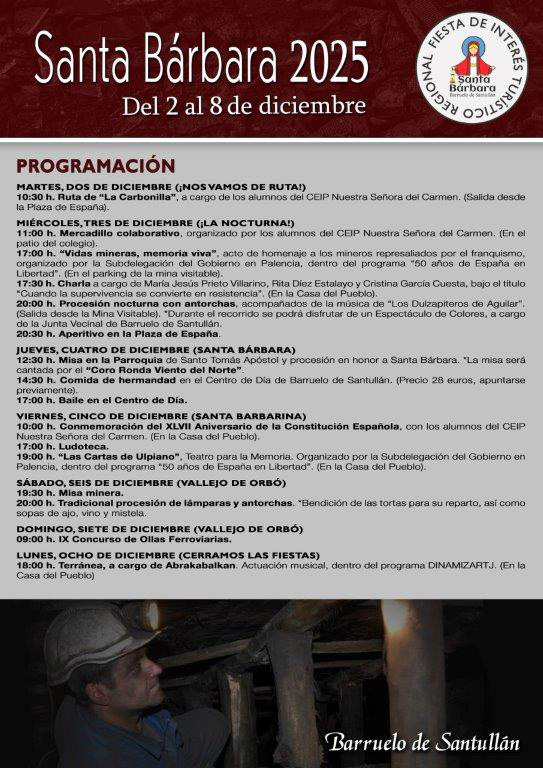 En la fiesta de Santa Bárbara, de Barruelo de Santullán, Palencia, destaca la originalidad de la celebración que radica en su relación estrecha con la minería, actividad que fue motor del municipio y de la provincia; pese a su carácter religioso, la fiesta está vinculada a un patrimonio industrial y a una cultura minera, que arraiga en el sentir propio de la población de Barruelo de Santullán y de la comarca.