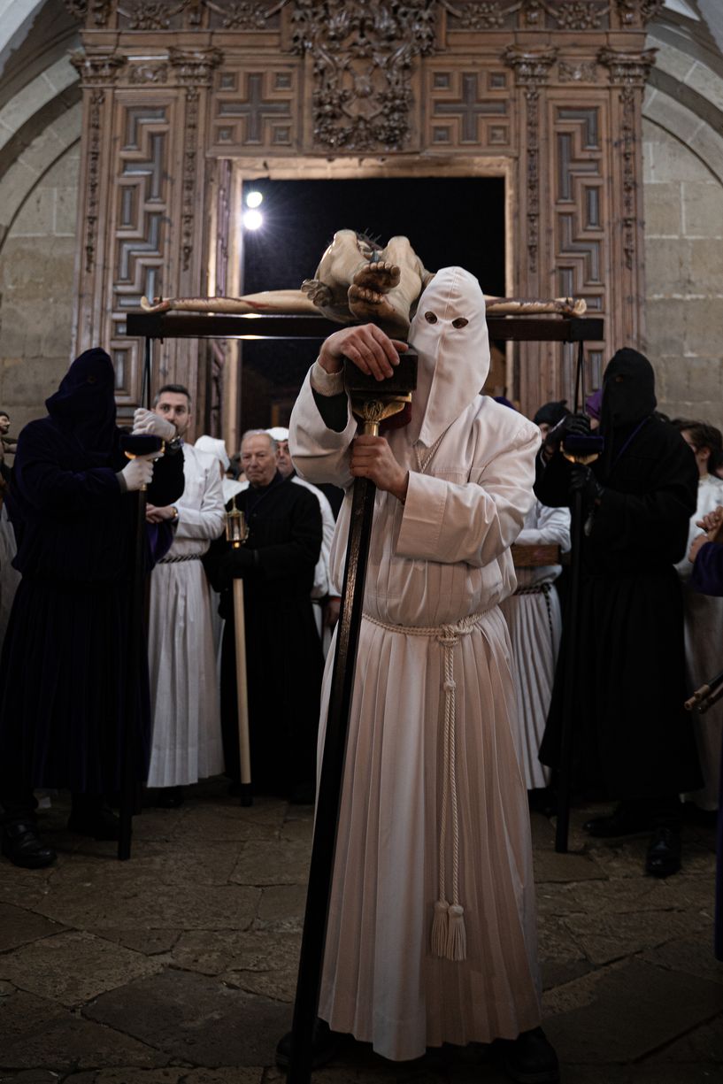Todos los pasos son portados a hombros por los hermanos entre las angostas y medievales calles de la localidad. Impresiona especialmente la salida de los llamados "Pasos Grandes", conocidos popularmente como "El Longinos" y "La Escalera", correspondientes a los pasos de "La Crucifixión" y "El Descendimiento".