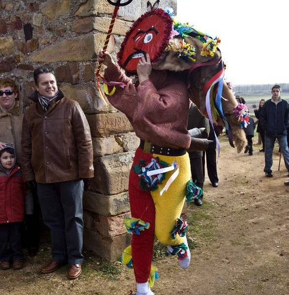 El Zangarrón lleva una máscara de cuero negro, ropa de colores, tres cencerros y dos esquilones a la espalda y un palo del que cuelgan tres vejigas hinchadas. Debe perseguir a los niños y las personas de edad avanzada. Las vejigas representan la fertilidad y los cencerros atados son para espantar a los espíritus.