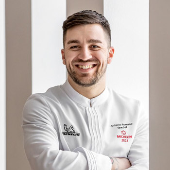 Né à Rome en 1993, après ses études, il s'installe à Londres où il travaille au Dinner (d'Heston Blumenthal), deux étoiles Michelin. De retour en Italie, il travaille sous la direction de Heinz Beck (trois étoiles Michelin) et fonde avec lui La Pergola. Il décide ensuite de s'installer à Milan, puis en Toscane, où il obtient sa première étoile Michelin à 26 ans. Ses expériences l'ont amené à créer une cuisine pour tous les goûts, où viandes, poissons et plats végétariens sont élaborés avec des approches variées, toujours avec une attention constante portée aux ingrédients et à la qualité des matières premières. Élégance et saveur sont les caractéristiques essentielles à la base de chaque plat.