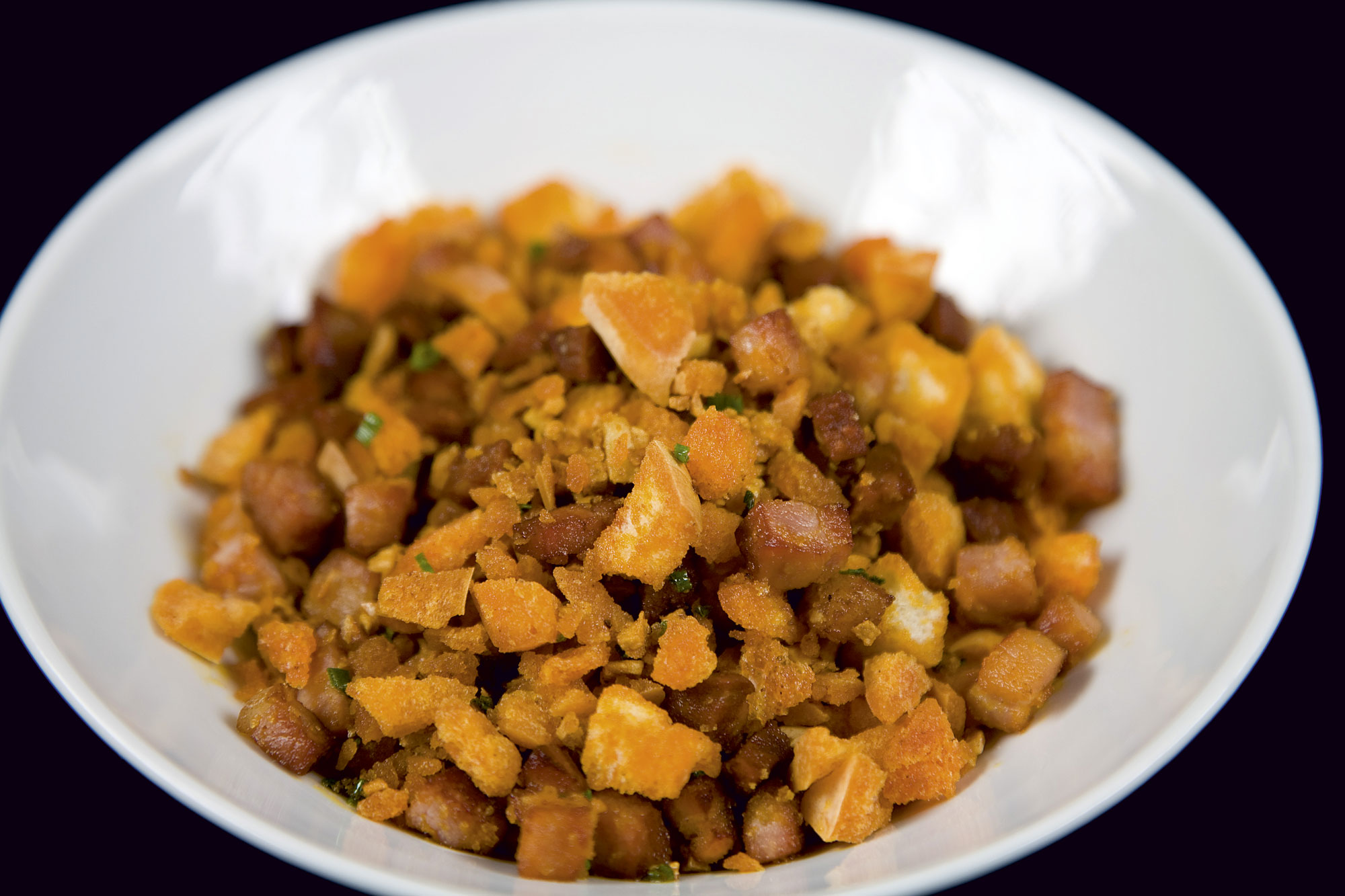 Faites chauffer l'huile et faites frire l'ail ainsi que le bacon et le chorizo pendant environ cinq minutes. Ajoutez le paprika et faites revenir. Puis ajoutez le pain émietté, le persil et l'eau. Remuez bien pour que toutes les saveurs se mélangent et s'imprègnent, et en même temps, pour faire évaporer l'eau.