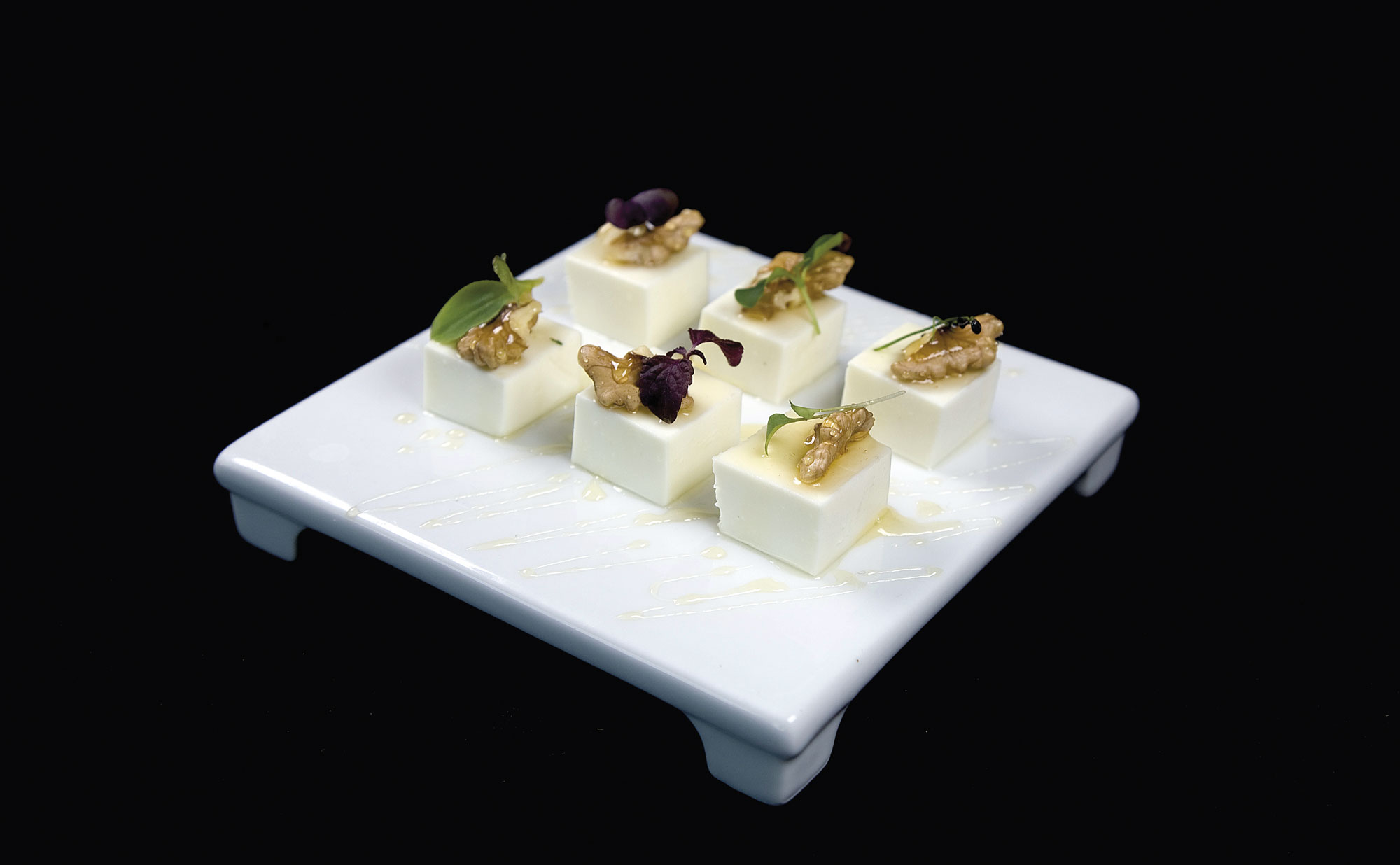 Coupez le fromage en quatre parts, couvrez avec du miel et placez les noix par-dessus.