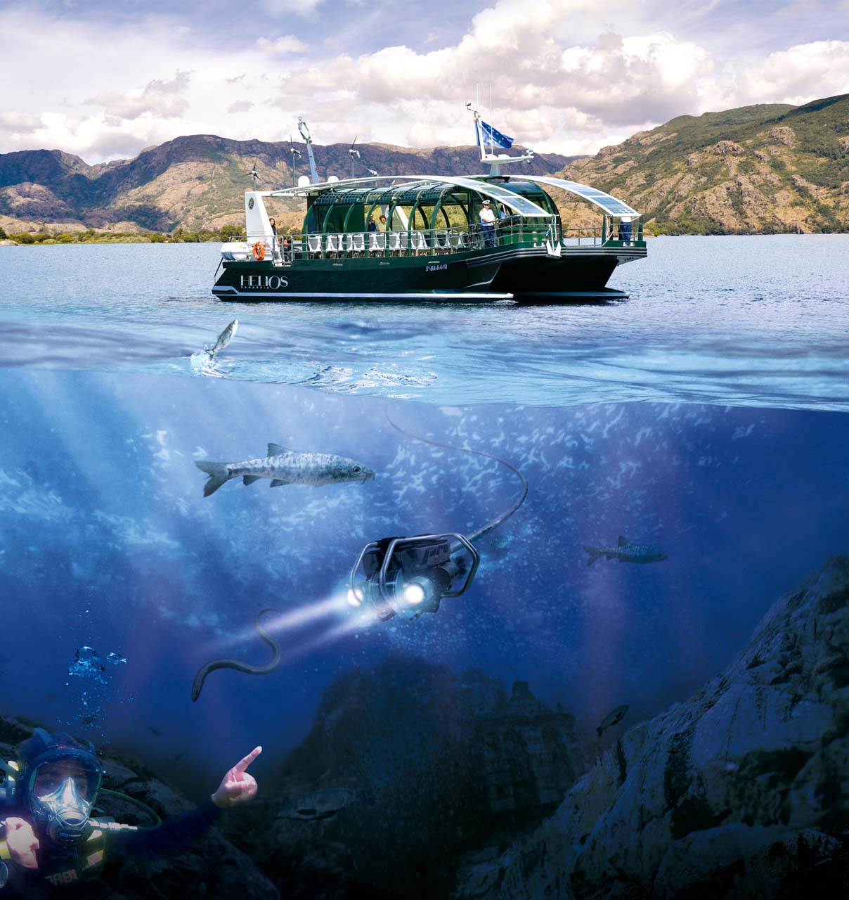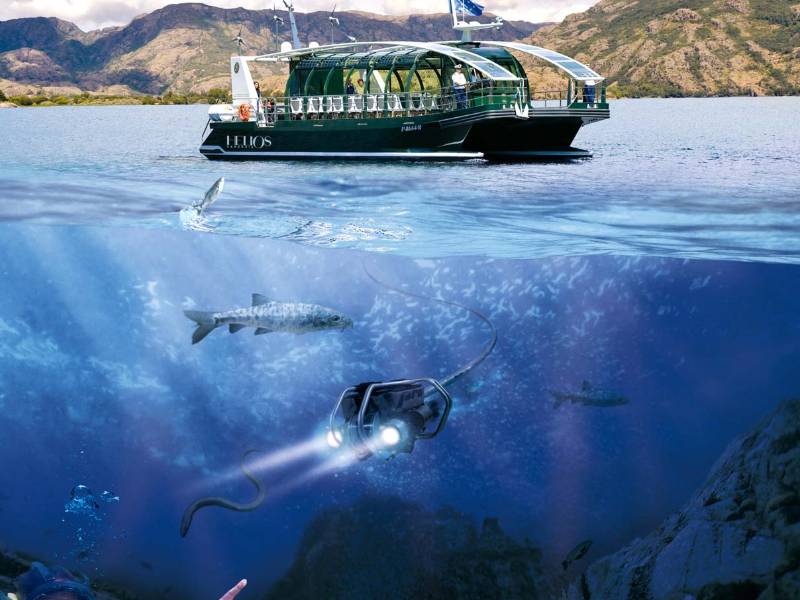 Ce premier catamaran éolien-solaire au monde, doté d'un pont vitré et pouvant accueillir 80 passagers, est certifié zéro émission, zéro effluent, zéro déchet et zéro décibel sonore. Les départs se font depuis le quai de Custa Llago, près de Ribadelago.