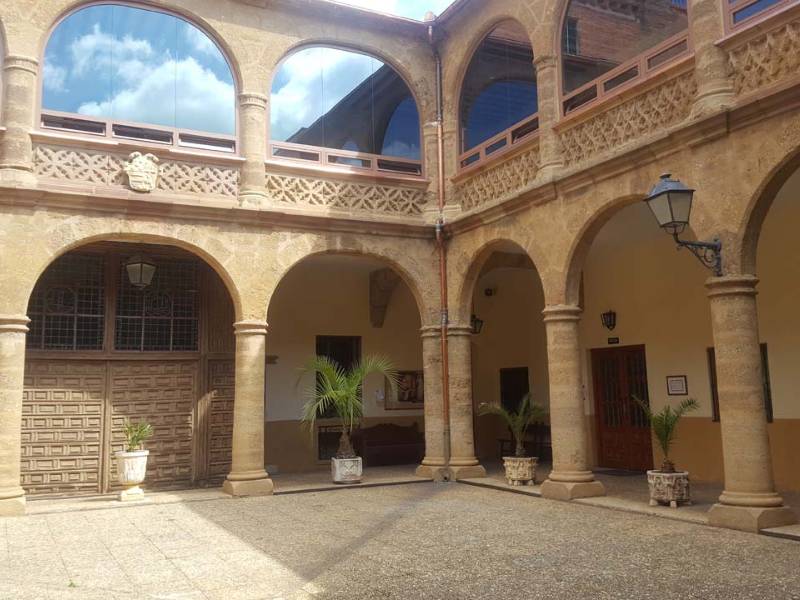 La façade est un bel exemple de la première Renaissance espagnole, lorsque ce nouveau style se démarque et que les influences gothiques persistent. A l'intérieur, la cour avec une double galerie voûtée et la chapelle se détachent.