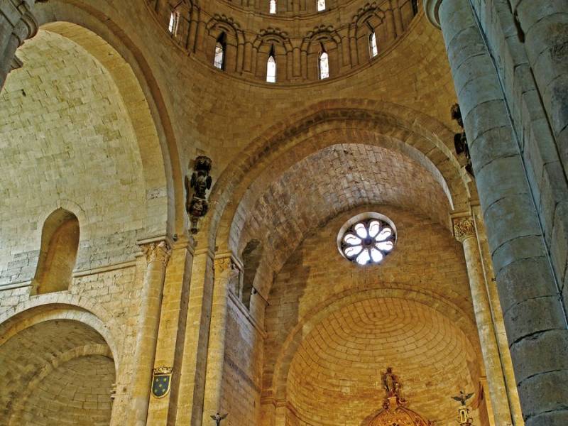Il possède trois nefs et un transept surmonté d'un dôme, et son portail nord est l'une des contributions les plus notables de l'architecture romane des XIIe et XIIIe siècles.Deux époques peuvent être distinguées: un premier maître utilisant du calcaire léger, créant un style roman évolué, et le second maître, qui termine la construction et couvre le temple, qui utilise du grès rougeâtre et des éléments architecturaux romans moins évolués.