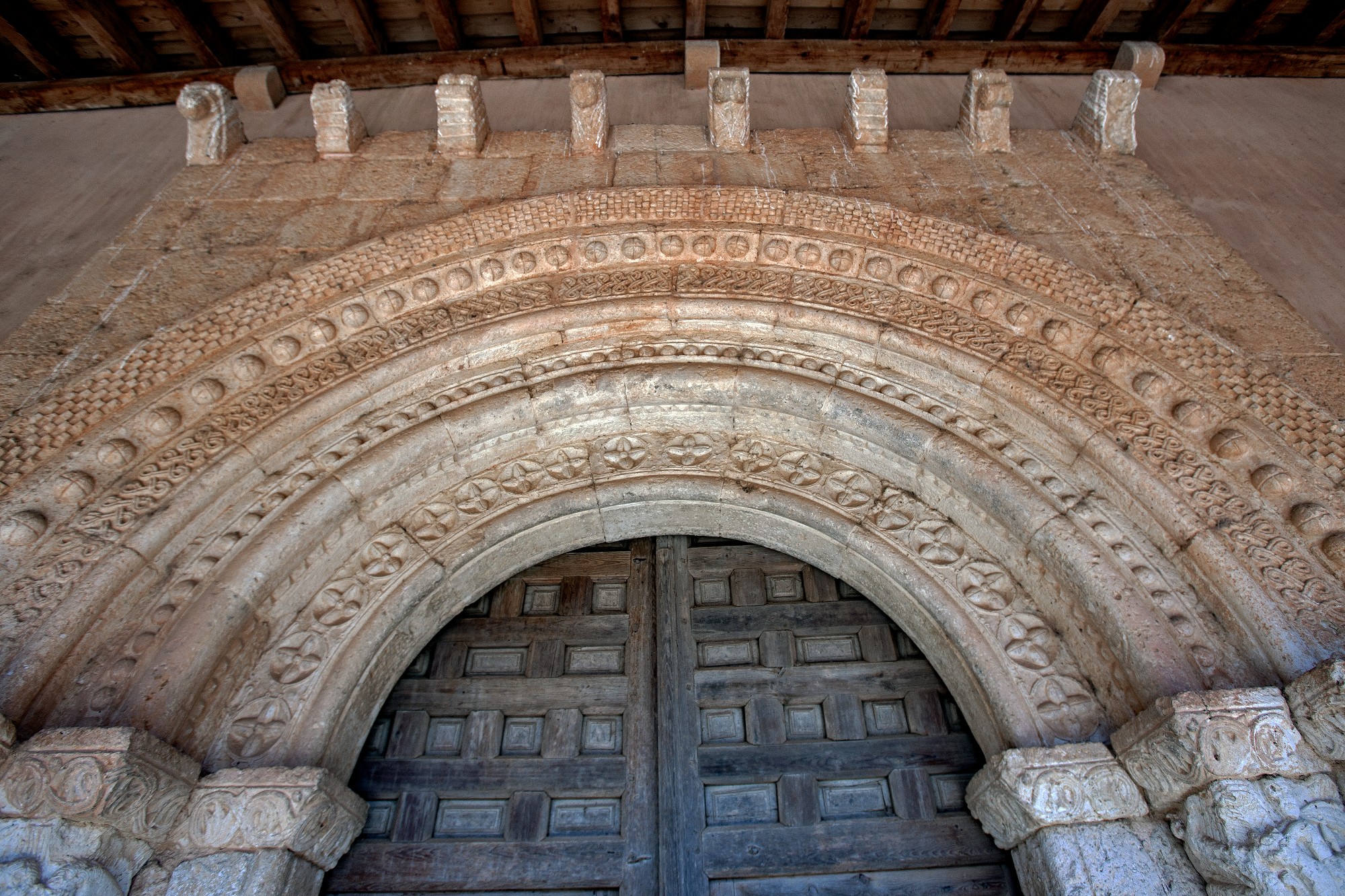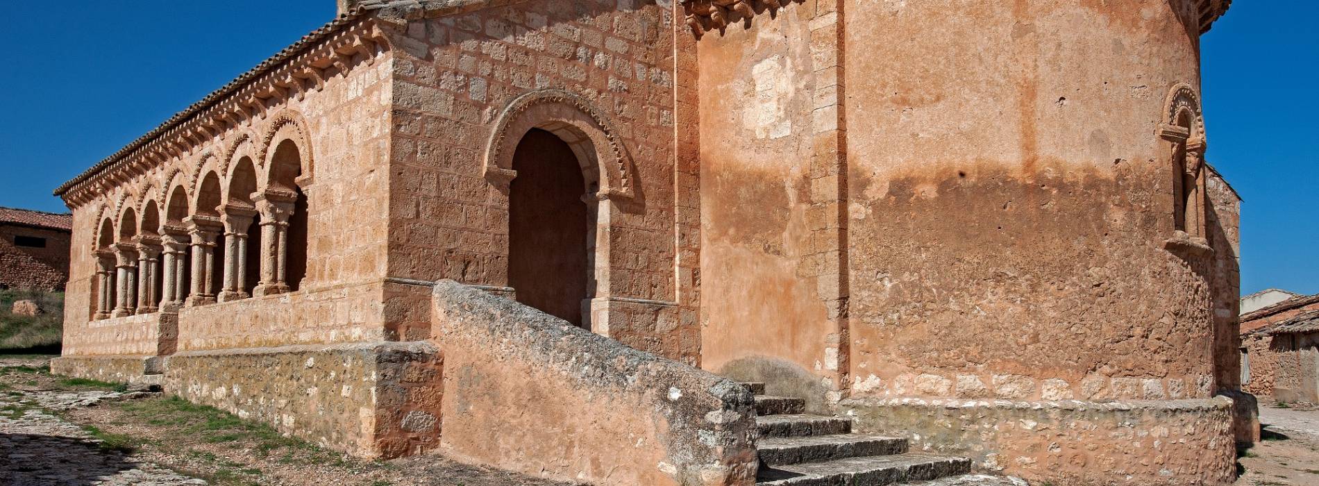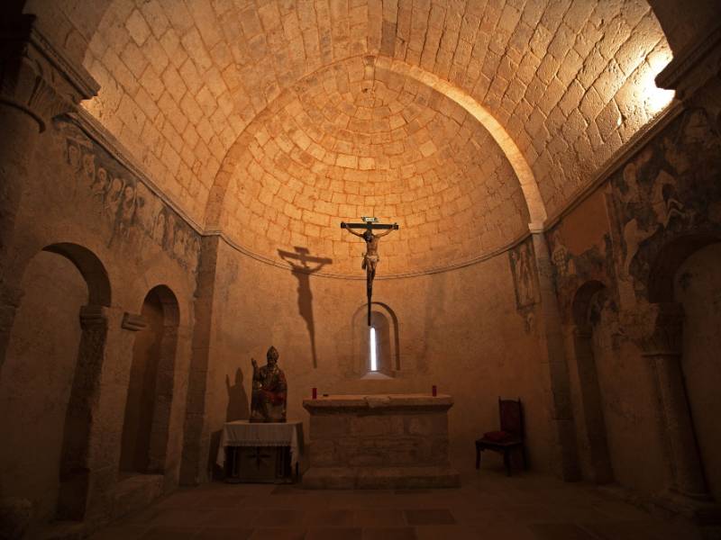 L’arc du triomphe, pointé, présente deux chapiteaux à palmette simple. Deux chapiteaux, rudes, surchargés ; l’un présentant deux quadrupèdes affrontés ; l’autre avec un animal attaquant un homme assisté d’un autre. À la partie méridionale, il y a une belle galerie à portiques dont les pierres contrastent avec la maçonnerie du bâtiment. Les éléments remarquables de cette église sont nombreux et nous ne pourrons les connaître qu’en la visitant. Un exemple unique qui mérite bien une visite.