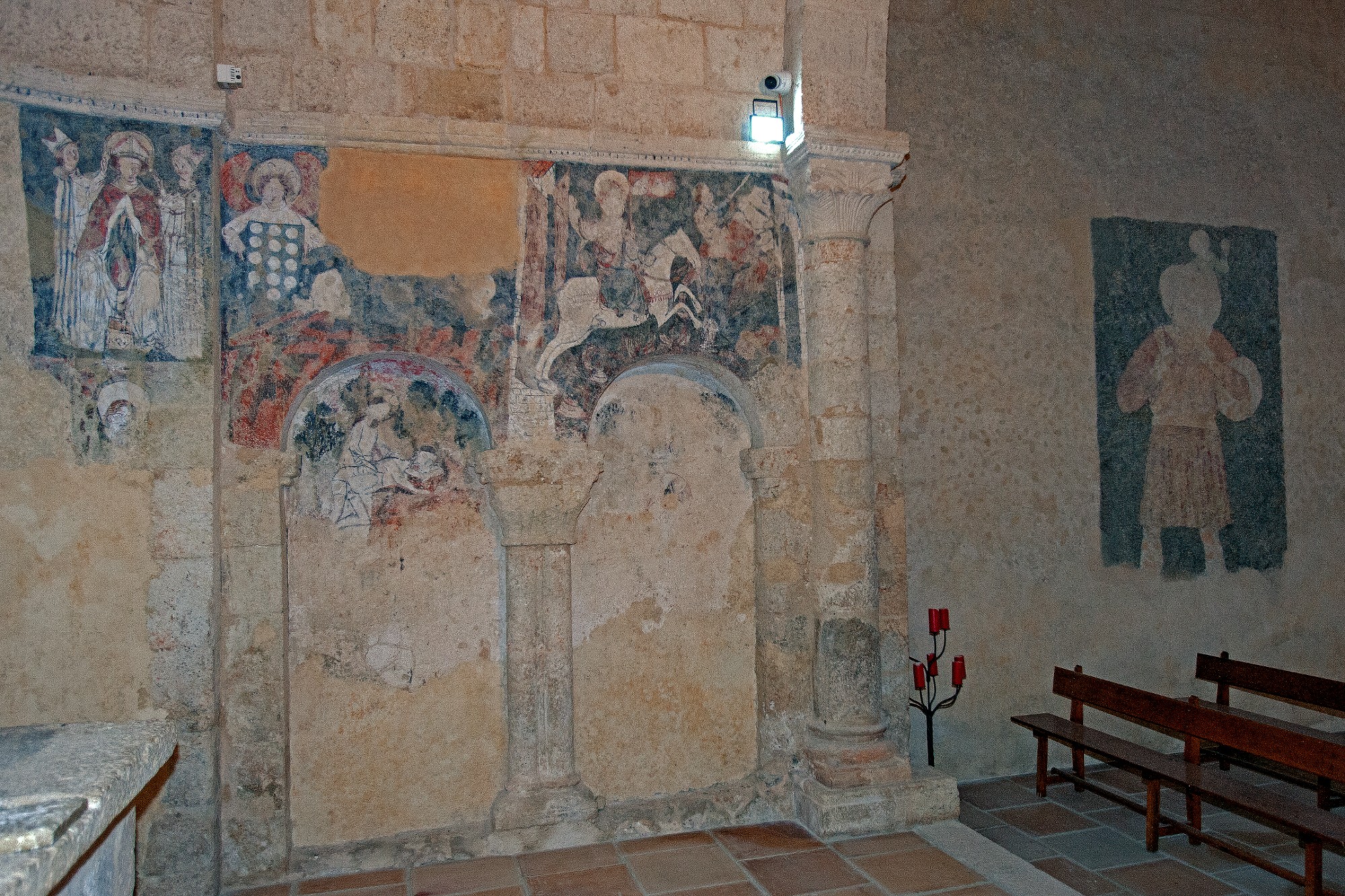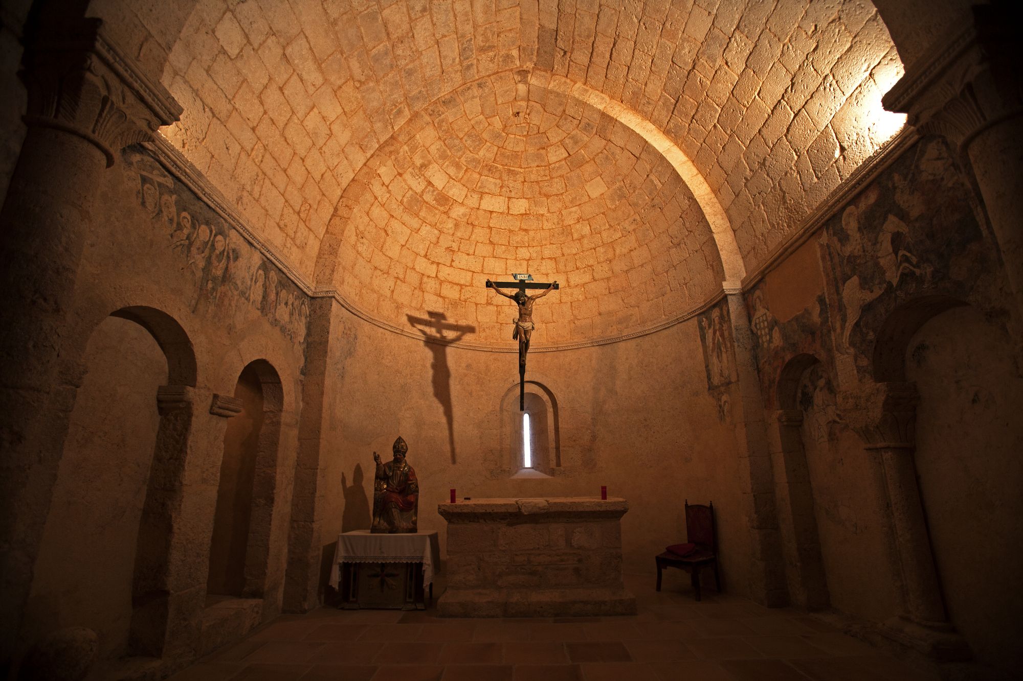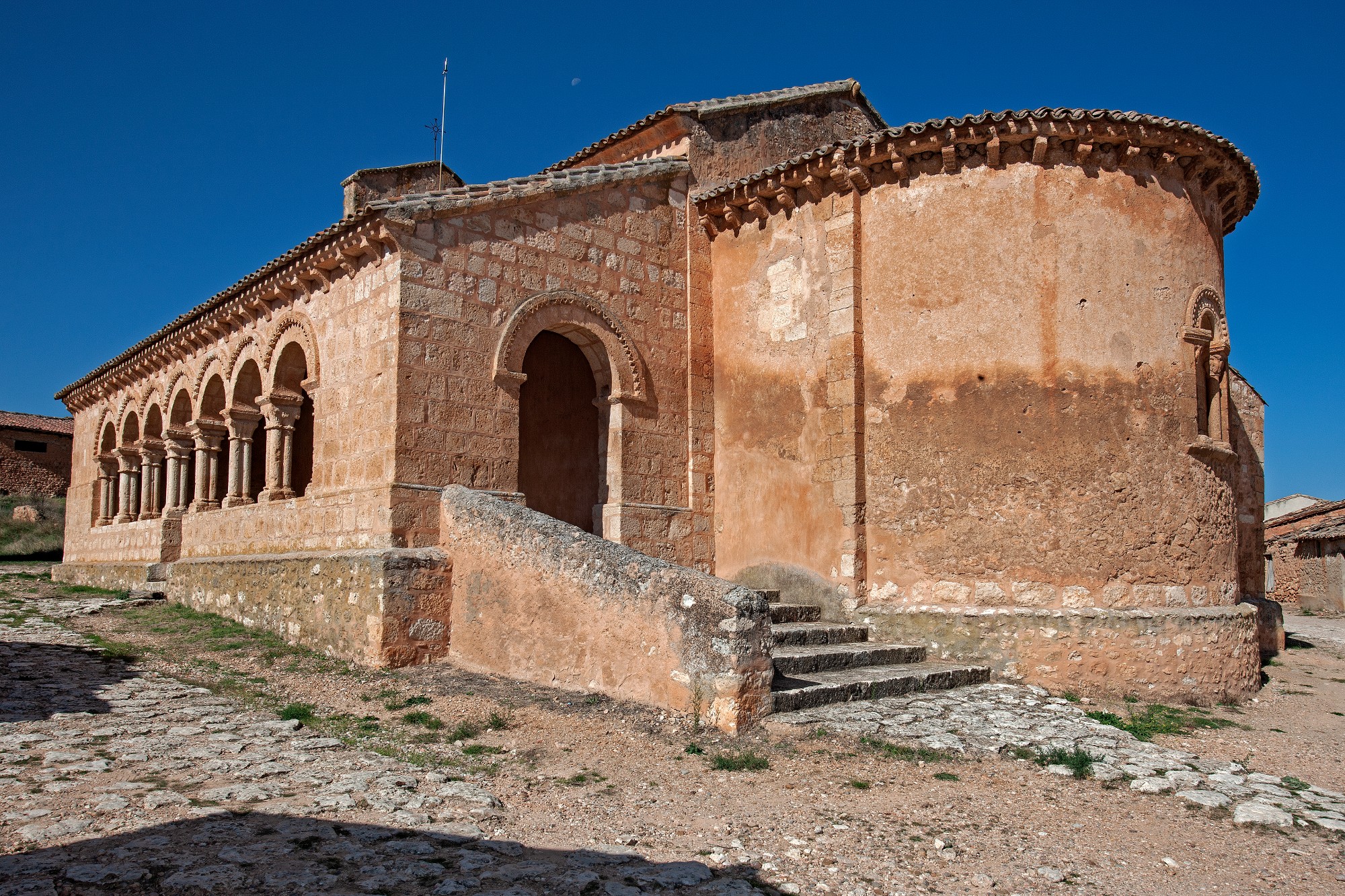 L’arc du triomphe, pointé, présente deux chapiteaux à palmette simple. Deux chapiteaux, rudes, surchargés ; l’un présentant deux quadrupèdes affrontés ; l’autre avec un animal attaquant un homme assisté d’un autre. À la partie méridionale, il y a une belle galerie à portiques dont les pierres contrastent avec la maçonnerie du bâtiment. Les éléments remarquables de cette église sont nombreux et nous ne pourrons les connaître qu’en la visitant. Un exemple unique qui mérite bien une visite.