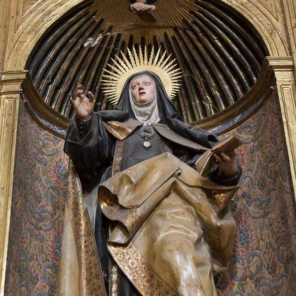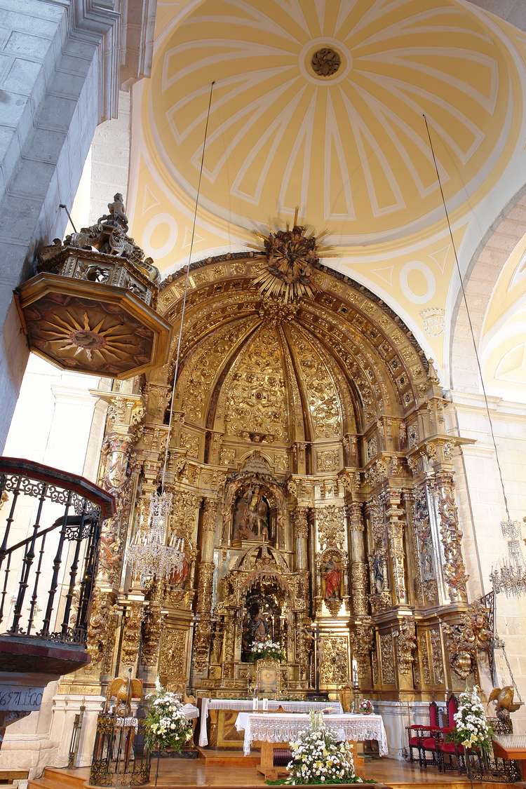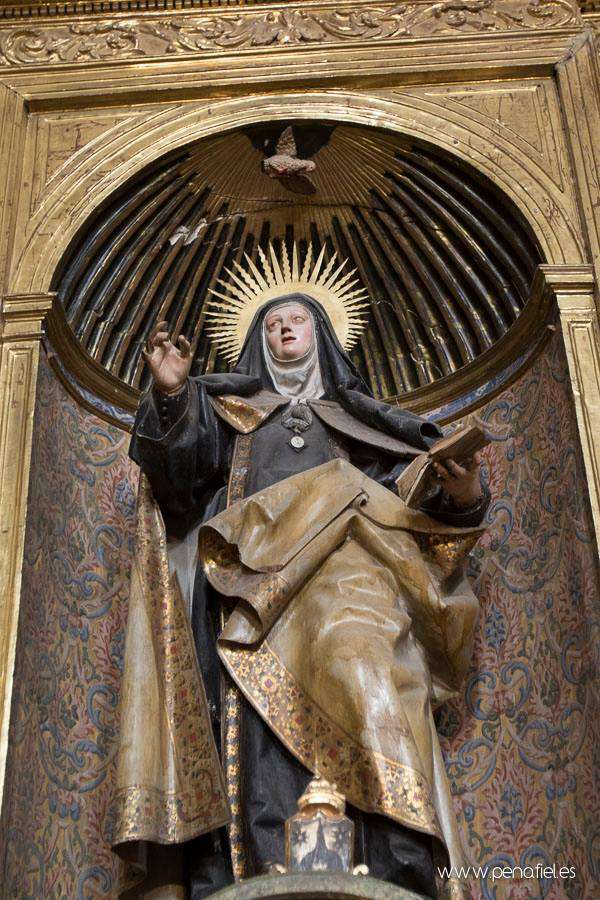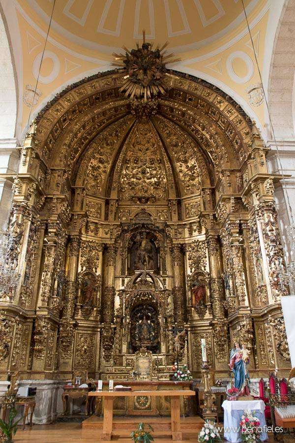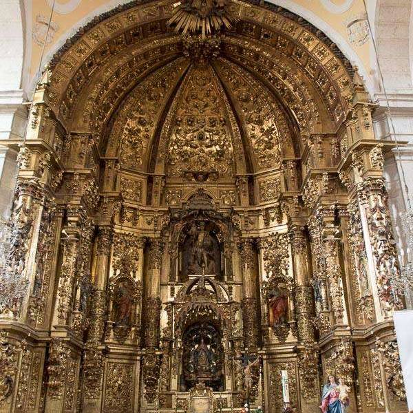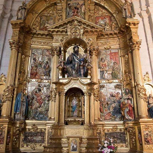 À l'intérieur, l'église se compose de trois nefs séparées par des piliers et des arcs en plein cintre, couvertes par des voûtes en stucs qui forment des pointes de diamant. La croisée est couverte par une coupole qui repose sur des pendentifs, où figurent les écussons des patrons de l'église. Le choeur haut a été reconstruit au milieu du XXe siècle. Du côté de l'Evangelio, on conserve la partie centrale d’une église romanique de la fin du XIIe siècle, restaurée et convertie en chapelle baptismale.