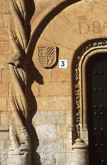 Sur le portail, on remarquera le blason principal encadré latéralement par une partie de l'arc pointu délimité par deux semi-colonnes torves sur lesquelles reposent des lions. Le patio, austère pour l'édifice, est doté en sa partie basse de galeries crenelées de type toscan.