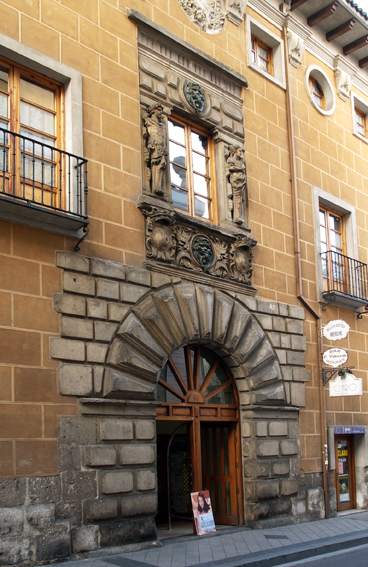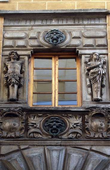 À l'étage principal, sur la façade, ressort une fenêtre rectangulaire encadrée latéralement par deux sculptures qui ont été traditionnellement identifiées comme la marquise et son amant. Des éléments importants de la composition sont les médaillons maniéristes. La façade présente également des arcs en plein cintre avec des blocs ornés de bossages, ceux de la porte principale et plusieurs fenêtres, des mascarons et des atlantes dans les fenêtres supérieures. Lors de la réforme du XVIIIe siècle ont été ajoutées des plâtreries sur le dessus du bâtiment. Flanquant la fenêtre principale du coin il y a des représentations d'Hermès et d'une Cariatide.
