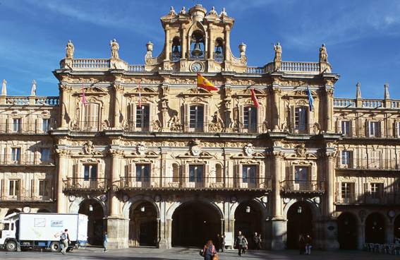La Plaza Mayor de Salamanca, du XVIIIe siècle, est l'une des plus belles places monumentales urbaines d'Europe. La construction a commencé en 1729 à la demande du corregidor Rodrigo Caballero Llanes. Le projet a été réalisé par l'architecte Alberto de Churriguera, qui a été suivi par son neveu Manuel de Lara Churriguera et a été achevé par Andrés García de Quiñones en 1755. Situé au centre de la ville, il forme un quadrilatère irrégulier soutenu, avec trois étages dans chaque façade, présidée par la Mairie. Dans le pavillon royal, l'effigie du roi Fernando III El Santo se détache et les médaillons des écoinçons sur ses arches représentent des monarques espagnols. Dans le pavillon sud, ou de San Martín dans les médaillons, nous voyons d'illustres soldats ou conquérants, tandis que dans le pavillon petrineros, les figures des médaillons sont des personnages de la culture.