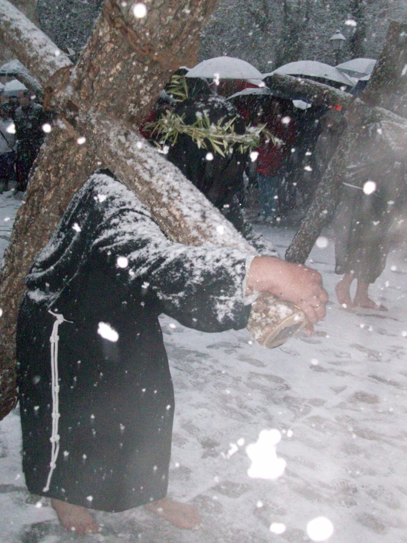 Les pénitents défilent en deux longues files vêtus d'une esthétique saisissante, avec l'habit franciscain, rassemblé par une corde, le visage couvert d'un voile monastique noir maintenu par une couronne tressée imitant la couronne d'épines, pieds nus, portant de lourdes croix en bois de chêne et de frêne des montagnes de Valsaín qui peuvent peser plus de 100 kg.