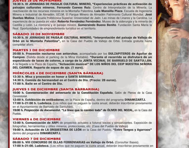 Dans la fête de Santa Bárbara, à Barruelo de Santullán, Palencia, l'originalité de la célébration se démarque, qui réside dans sa relation étroite avec l'exploitation minière, une activité qui a été le moteur de la municipalité et de la province ; Malgré son caractère religieux, la fête est liée à un patrimoine industriel et à une culture minière, ancrés dans les sentiments de la population de Barruelo de Santullán et de la région.