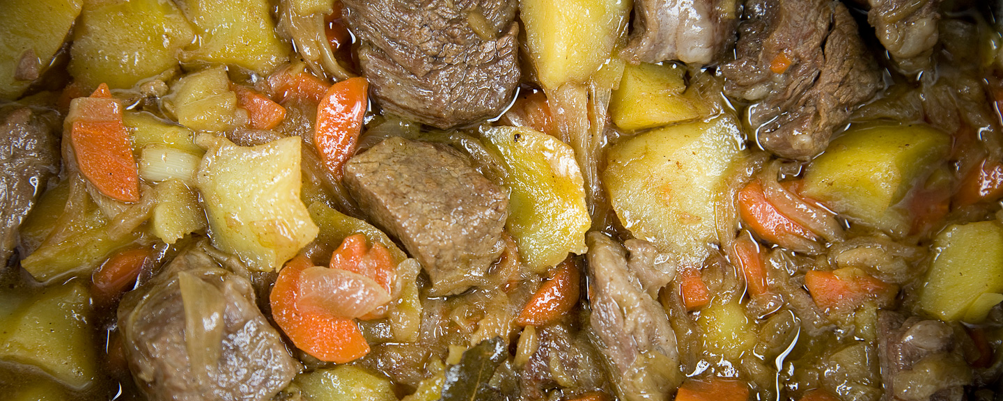 Pique a carne em cubos. Aqueça o azeite e frite delicadamente o alho e a cebola por alguns minutos. Adicione a carne, tempere e deixe ferver por cerca de quinze minutos. Adicione todos os vegetais, exceto as batatas e cozinhe mais dez minutos. Adicione o vinho branco e cubra com água, ferva mais cerca de 30 minutos até a carne estar quase cozida. Adicione as batatas e cozinhe por cerca de quinze minutos.