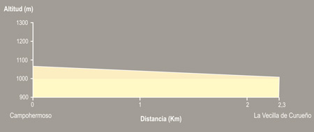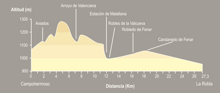 A rua principal de Campohermoso torna-se, no extremo oeste da cidade, uma estrada que leva a Aviados. Aí o percurso atravessa a localidade e termina com uma descida ao Vale Valdesalinas. Seguindo o caminho da mina Bardaya, chegamos ao Barrio de la Estación, ponto de viragem da etapa. Depois de fazer o desvio de Orzonaga, viramos para sul pela estrada Vega Pepina. Seguir pela CL-626 em direção a Candanedo e daí até La Robla.