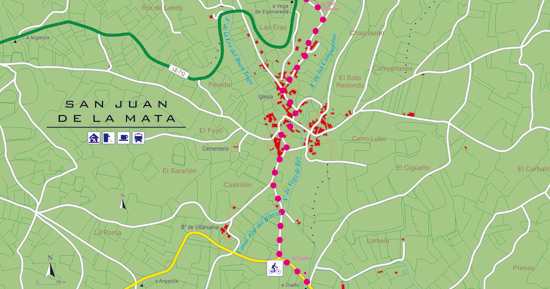 Entre San Juan de la Mata e Cueto, o percurso segue por uma estrada secundária. Você sai da cidade pelo extremo sul, ao longo de uma longa linha reta na qual atravessa o Canal Alto de El Bierzo. A seguir existe um entroncamento rodoviário que leva a Arganza. Sem fazer este desvio, continuamos até Cueto num troço que se sobrepõe à rota 1 de Barruelo de Santullán a Balboa, neste ponto assinalado com sinalização para a etapa de Toreno a Cacabelos.