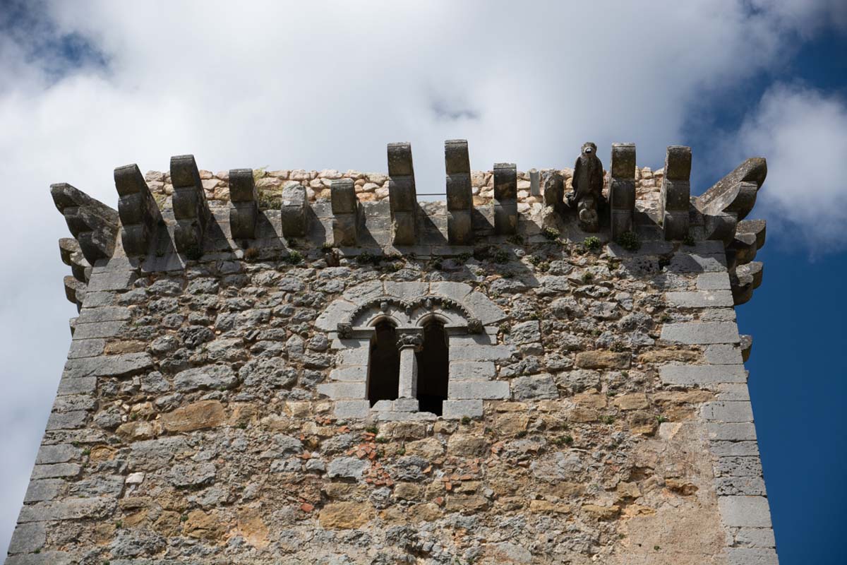A cobertura da torre é uma abóbada pontiaguda que apresenta restos de pinturas e é sustentada por cachorros decorados com cabeças e personagens. Na chave desta abóbada encontra-se um agnus dei, figura de um cordeiro que alguns estudiosos enquadram no simbolismo templário.