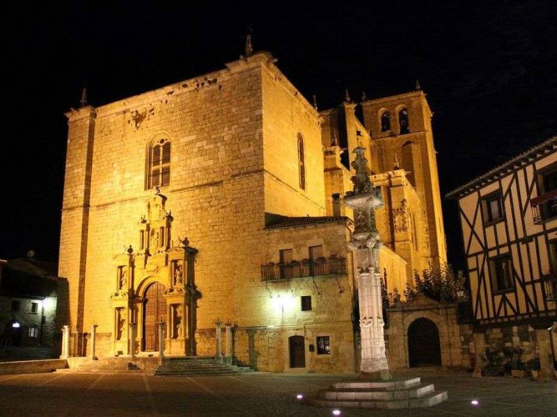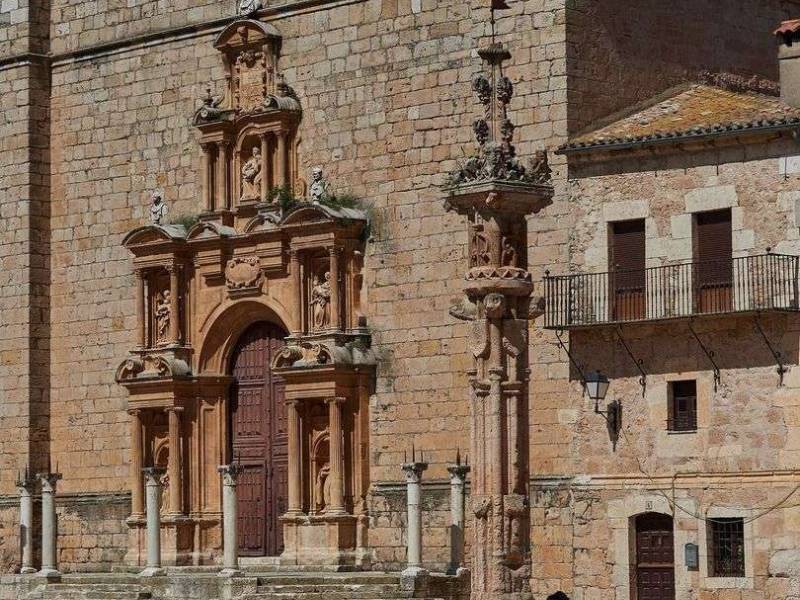 Fachada barroca, os três bustos superiores e as colunas são romanas, da vila de Clunia. Estrutura do século XVI que contém, no presbitério, o coração do Conde do Montijo, pai da Imperatriz de França.