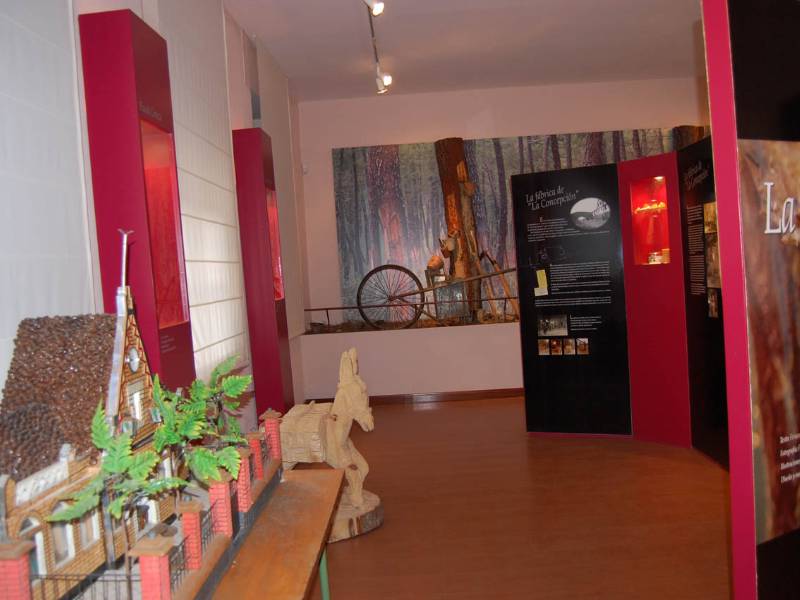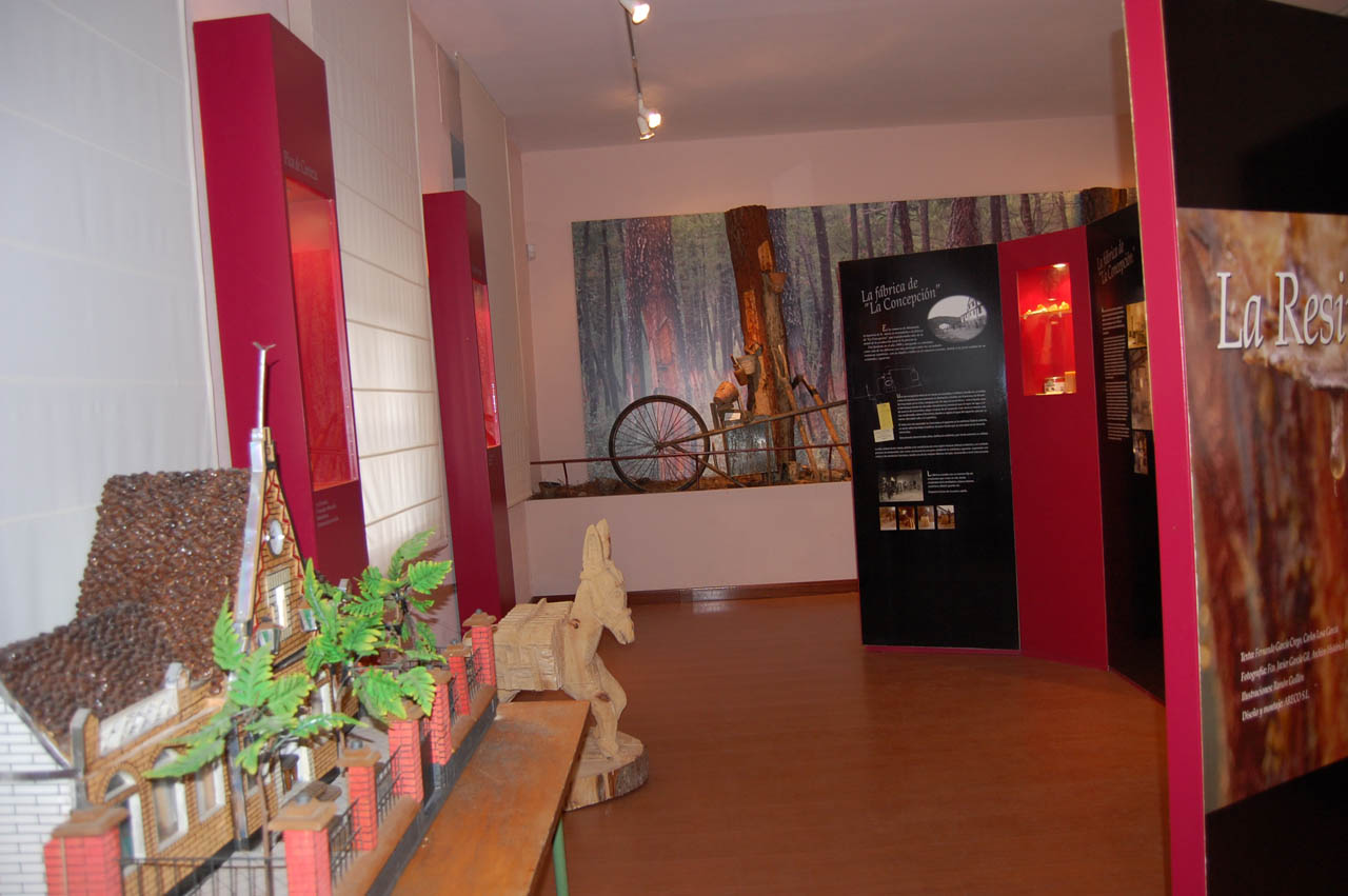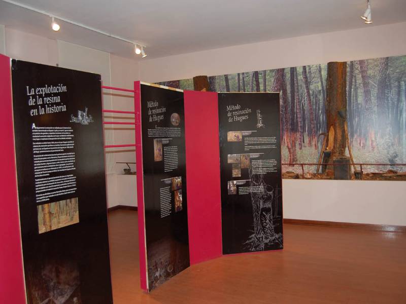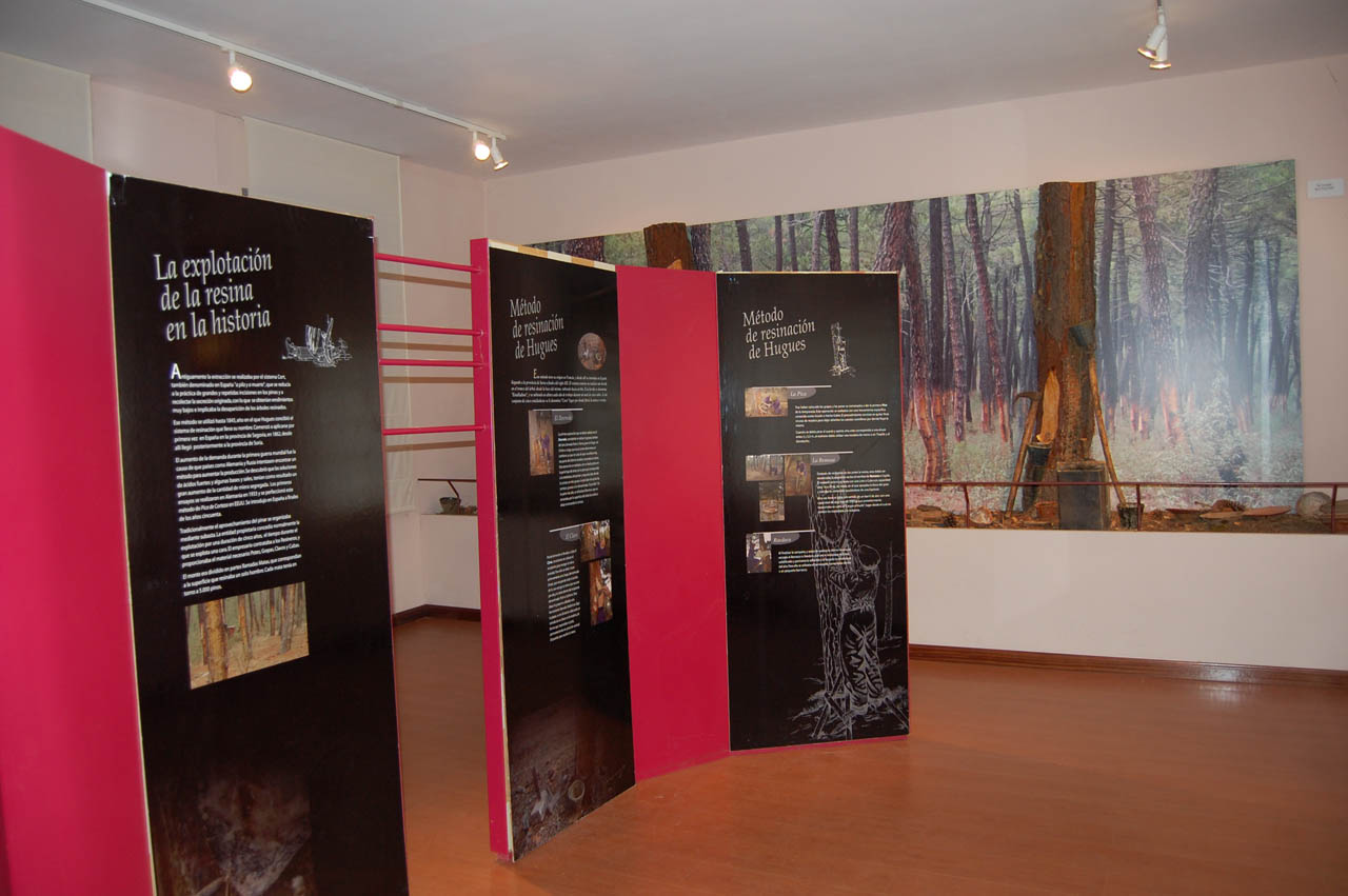Exposição sobre o processo de extração da resina e os materiais que foram utilizados no passado. Um laboratório analisa produtos de vegetação rasteira, fungos e cogumelos.