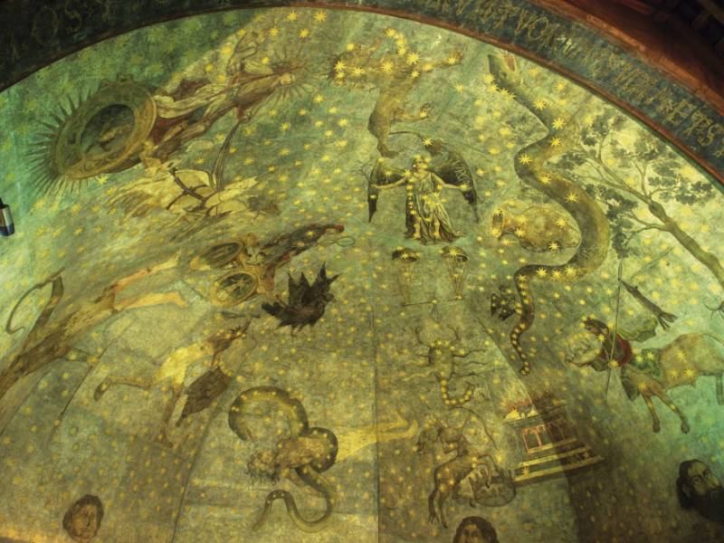 No salão encontra-se um escudo universitário que representa uma cátedra académica com as armas de Castela e Leão. Numa das suas salas pode-se ver o chamado Céu de Salamanca.