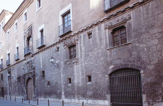 A varanda é emoldurada por finas colunas com balaustradas, com cachorros decorados por seres fantásticos, que se repetiam num friso inferior e ladeando o escudo dos Mendoza.