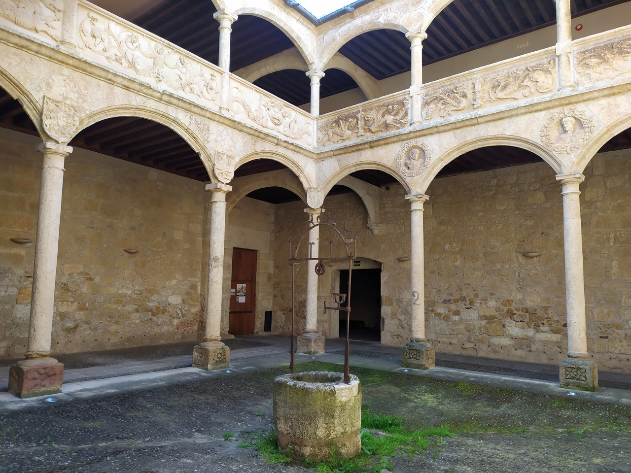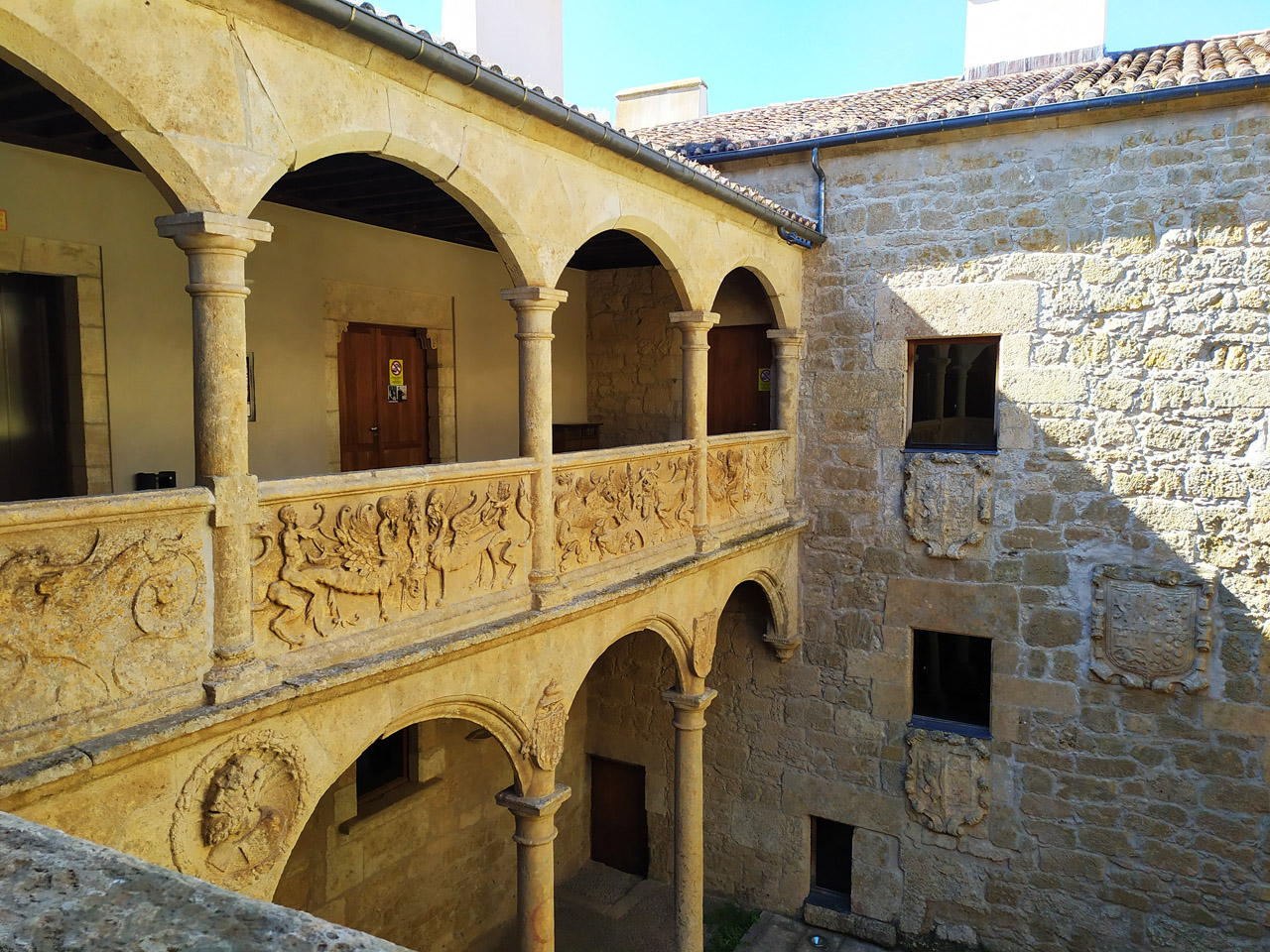 Há uma moldura importante que cobre a varanda com um leão e uma águia. No interior existe um pátio quadrangular do século XVII com galeria dupla em três lados; existem arcadas elevadas em colunas. Em cada uma das bases do piso inferior existem escudos e medalhões alusivos à família; acima a ornamentação é de estilo plateresco.
