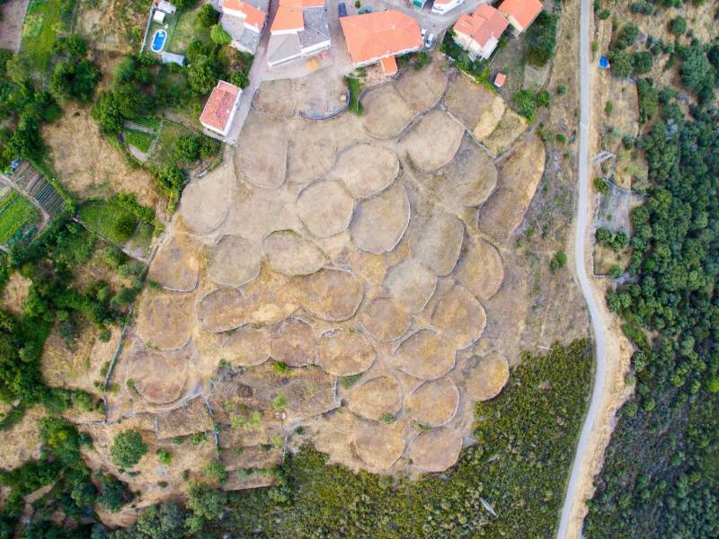 Trata-se de cerca de trinta eiras circulares pavimentadas com lajes de pedra, utilizadas para a debulha de grãos, cercadas por muros de pedra seca para conter a colheita. Estão dispostas em terraços, adaptando-se à topografia do terreno, formando uma paisagem escalonada em direção ao rio Agadón, com um aspecto um tanto " fortificado ".