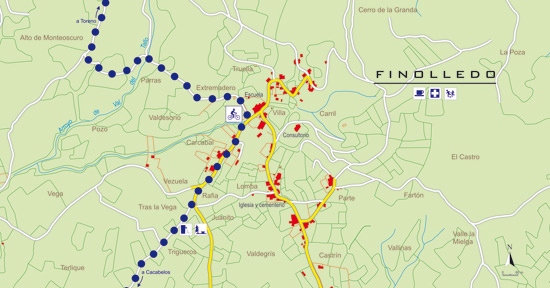 要前往Toreno,这条路线从 Plaza de Finolledo出发,沿着一条环绕草地和农田的土路前行,然后上升到 Cerro de las Cabeceras(760 米)。绕过这座山,这条路线随后下降到Tebra地区,在那里与 Valdelaloba 和 Pradilla 路汇合。沿着这条路,我们向西北返回,到达蓬费拉达高速公路的环形交叉路口。在另一边,行程继续沿着旧路前往Toreno 。