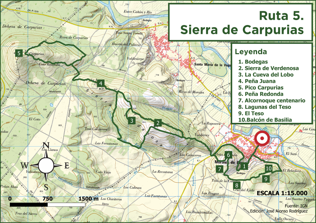 路线的起点和终点均位于Morales尔雷伊教堂广场,沿着Morales尔雷伊和圣玛丽亚德拉维加的松树、圣栎、橡树和五倍子树之间的小径行进。路线分为三个环路,适合任何水平。
