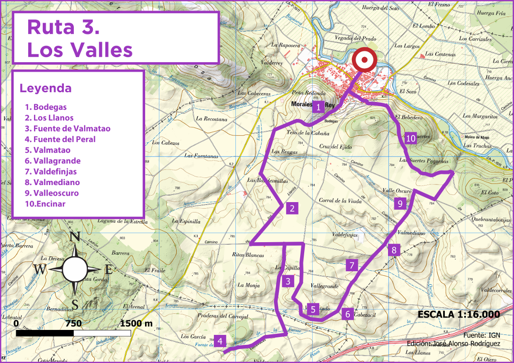 这是一条环形路线,起点和终点均为Morales雷伊教堂广场。路线沿着Morales雷伊和基鲁埃拉斯德维德里阿莱斯之间的卡普里亚斯山脉的小径和道路延伸。