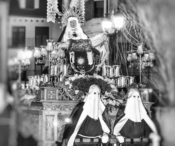 似乎在 16 世纪,圣弗朗西斯科修道院的僧侣们对这些游行最感兴趣,因为除了古老的拿撒勒人像之外,提到的几个台阶都来自该修道院,并在因没收而解散时收集起来,要么在附近的圣克拉拉修道院(基督被绑在柱子上,拿撒勒人,晚餐,亲吻),要么在圣玛丽亚教区(多洛罗萨)。然而,圣胡安和圣巴勃罗修道院(今天的圣巴勃罗)的多米尼加人也紧随其后,因为他们在 16 世纪下半叶或 17 世纪初同时委托制作了卧姿基督像,也许还有一点索莱达,这是一幅礼服像,在耶稣受难日庄严地结束受难游行。