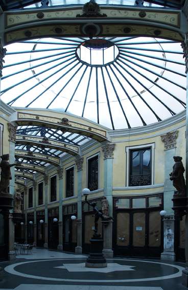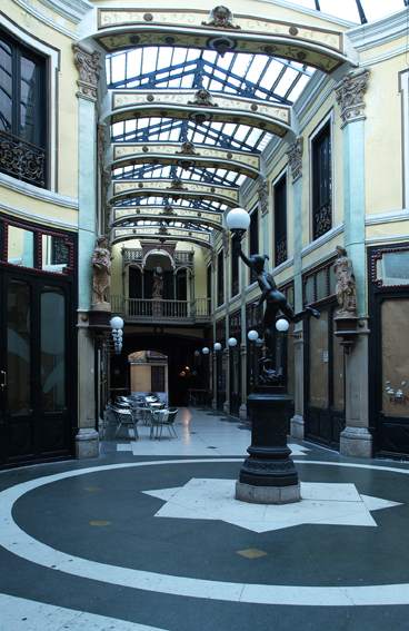 通道的屋顶与建筑的其他部分是独立的。除了中央圆形大厅的屋顶由铁和玻璃砖制成外,支撑结构都是木制的。天花板上装饰着萨尔瓦多·塞亚斯 (Salvador Seijas) 的画作、灰泥装饰和植物图案。入口大门是用不同方式制作的格栅,上面刻有建造日期 1885/86 和铭文"Pasaje Gutiérrez" 。