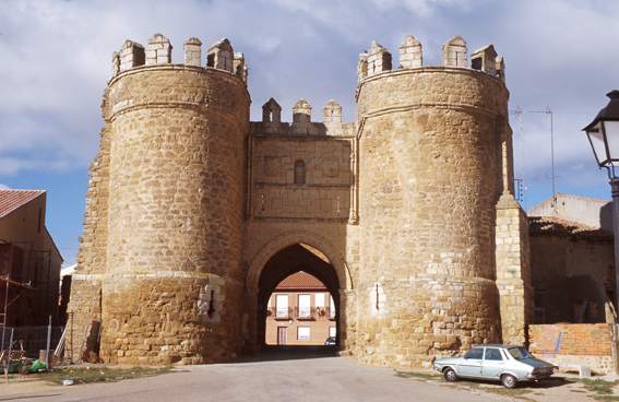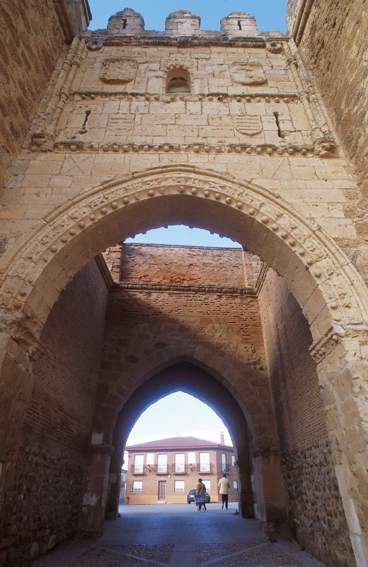 门洞位于两座垛口状塔楼之间,塔楼上方是前拱门,由一道幕墙连接,在幕墙中可以看到该镇的徽章和以方济各会绳索为框架的贝拉斯科 (Velasco) 徽章,两者之间由一个空壁龛隔开。