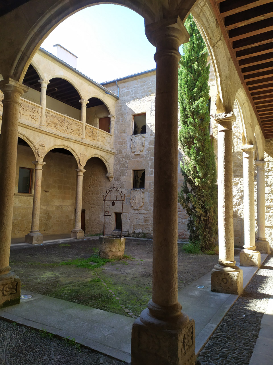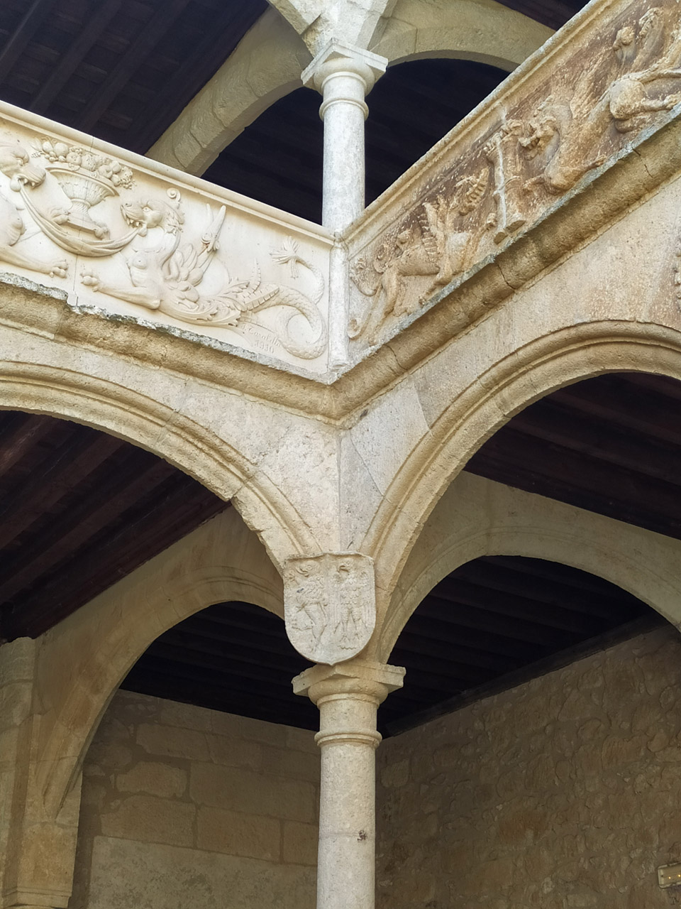 阳台周围有一个重要的围栏,上面雕刻着狮子和鹰。里面有一个四边形的 17 世纪庭院,三面都有双廊;柱子上有凸起的拱廊。下层的每个底座上都有象征家族的盾牌和徽章;上面的装饰是银匠风格。