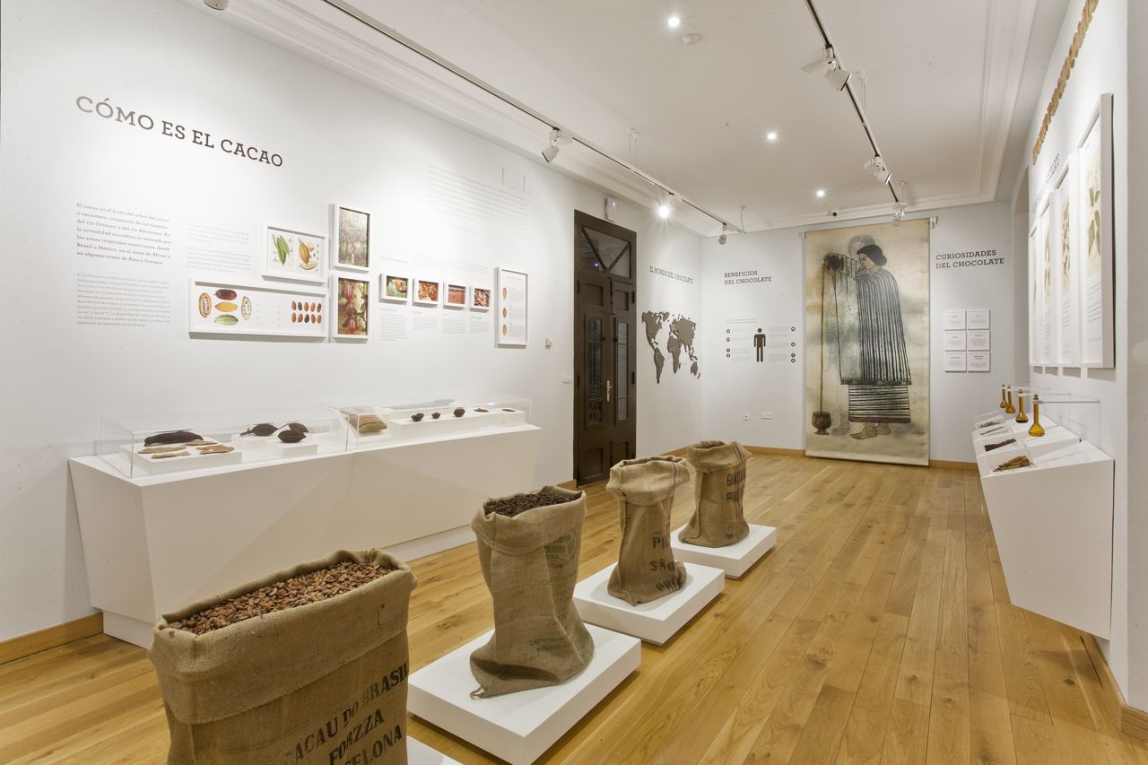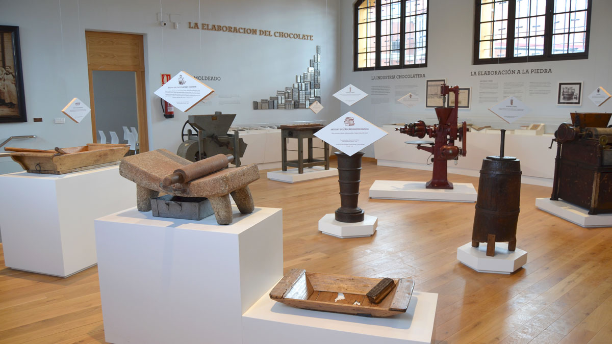 展示巧克力制作历史的仪器和物品:烤面包机、精炼机、滚筒、槽、研钵、模具以及十九世纪初机器的模型。