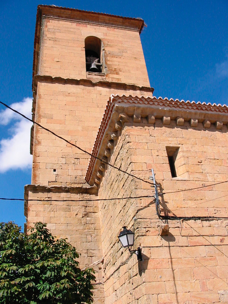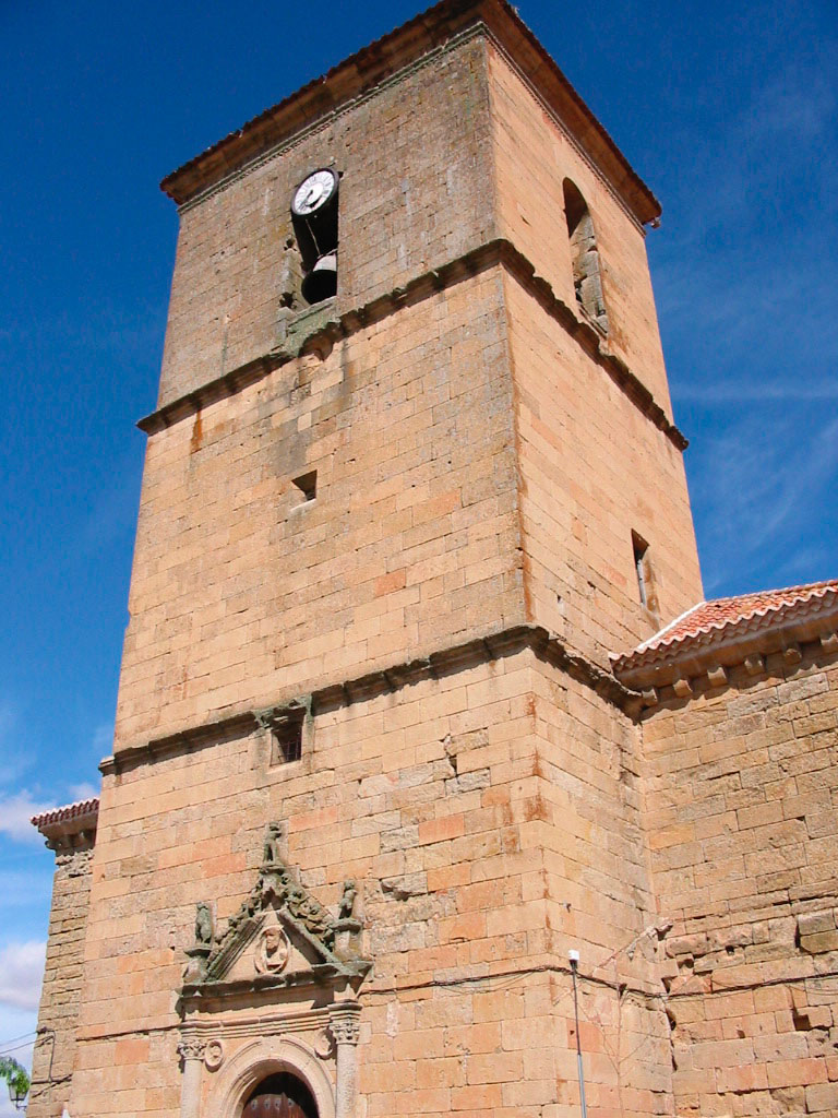 教堂采用精雕细琢的砂岩砌筑,石工痕迹众多,三个中殿和横厅入口处呈矩形。中殿建于 16 世纪,覆盖着木制框架,最初为八角形,后来为扭力和关节形,与维洛里亚教堂的框架相似。脚下是一座优雅的塔楼,建于同一世纪,塔楼内有一扇银匠风格的门。