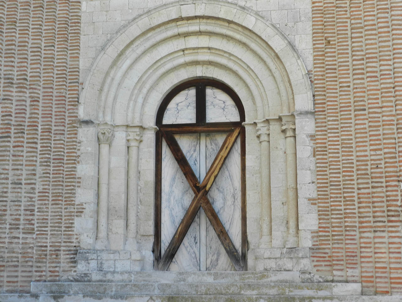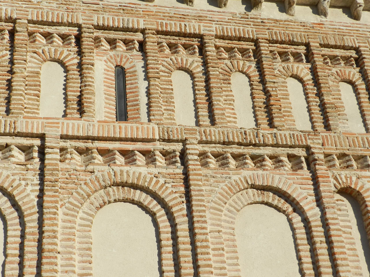 它由一个宽阔的中央大厅和两个较小的大厅组成,三重后殿装饰有盲半圆形拱廊系列、带边缘的窗户和对角砖的饰带。