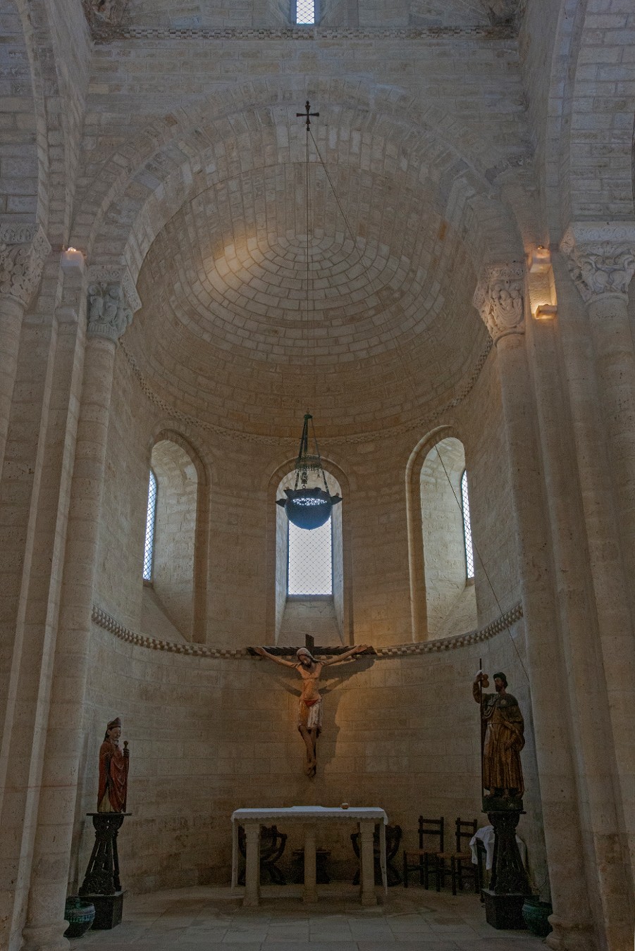 山墙的角落处有两个有趣的塔楼和一个 13 世纪的哥特式十字架。教堂内部,三个中殿被分成五个部分,第五个部分高于其他部分,构成了横断面。中殿被圆形筒形拱顶覆盖。侧拱顶比中央和横断面的拱顶更低更窄,并支撑在圆拱上。