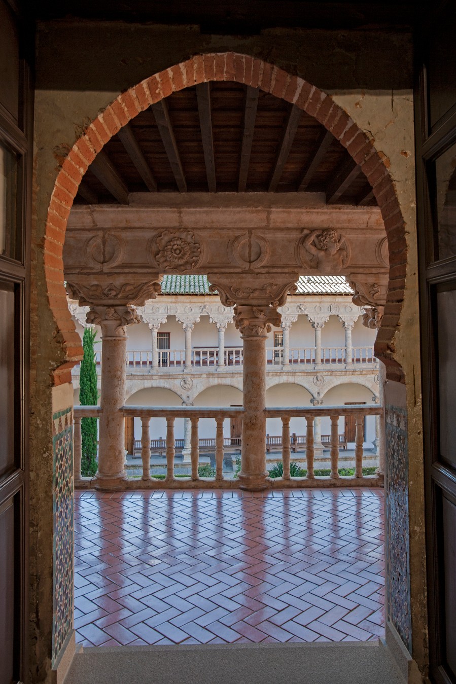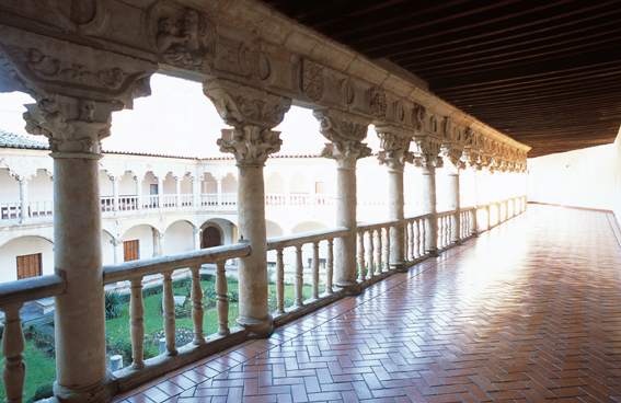 寺庙和外墙据信是由修士马丁·德·圣地亚哥设计的,他用千斤顶拱形凉廊完成了这座建筑,自然光通过带有半圆形拱门的大窗户照进来。回廊是修道院的亮点之一,因为它装饰华丽,雕刻精美。它呈五边形,分为两层。精致而极其美丽的雕塑装饰是阿隆索·贝鲁格特门徒的作品。该遗址以其丰富的建筑和精致的室内装饰而引人注目。