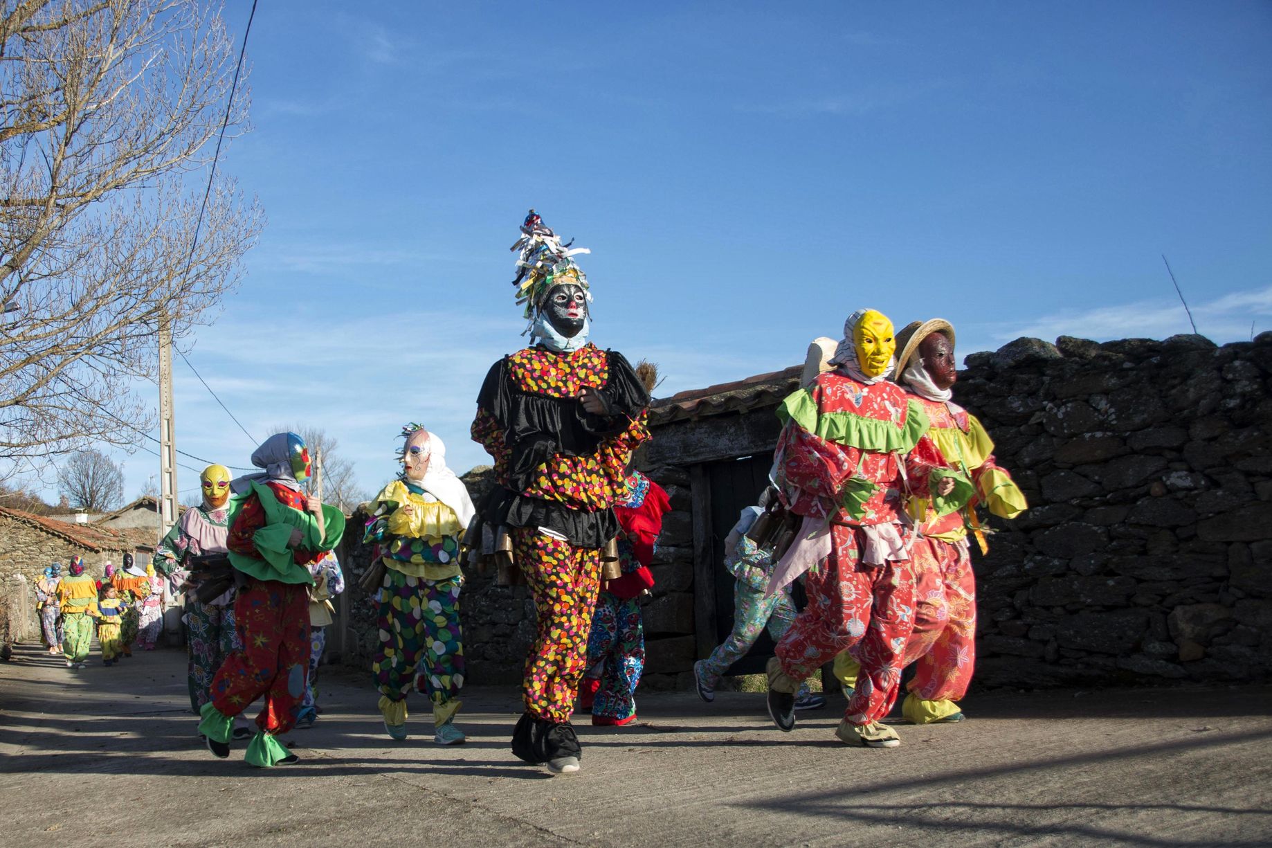 传统服饰包括色彩鲜艳的带有花卉或小丑图案的套装、上衣和宽松的裤子。面具由当地人手工制作,通常由压制的纸、蜡或皮革制成。为了隐藏身份,他们用围巾或碎布遮住后脑勺。最有特色的是他们腰间系着的牛铃,数量不一,在庆祝活动期间,牛铃响彻整个村庄。