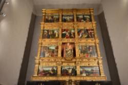 基督君王教堂更多信息这幅文艺复兴时期的祭坛画来自 Vera Cruz de 巴尔德拉斯教堂,建于 16 世纪的第二个三分之一,由镀金的彩色砖石构成,并以怪诞图案和烛台图案进行华丽装饰。通过一系列的壁柱和檐壁,该建筑群分为四个部分,拥有三条街道。只有第二部分的中央街道上有一尊圆形的圣母子像,其余部分则被图画板占据,其中,在构成下层的一组六位使徒上,描绘了耶稣幼年时期和圣母玛利亚的情节,上层还有一组三幅描绘耶稣受难像的图画板。