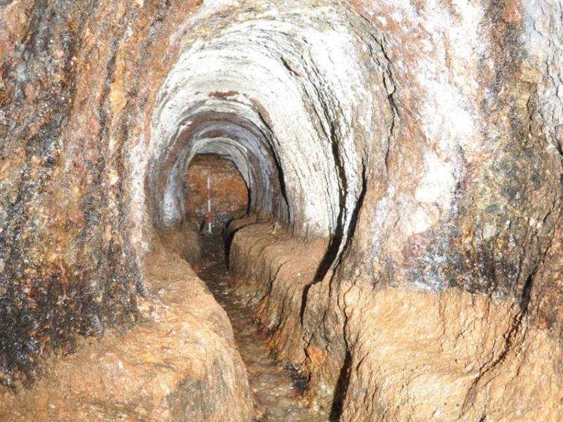 这条隧道的目的是为了方便从矿井内部开采某些石英脉,同时作为大型露天矿的排水通道。隧道向西南方向延伸40米,然后急转弯,几乎呈90度角向北延伸,寻找石英脉。隧道入口附近两侧各有一个相对的凹槽,用于支撑矿井封堵,可能使用了原木。该矿井的另一个显著特征是其中央排水沟,该排水沟凿刻于岩石中,深约50厘米。