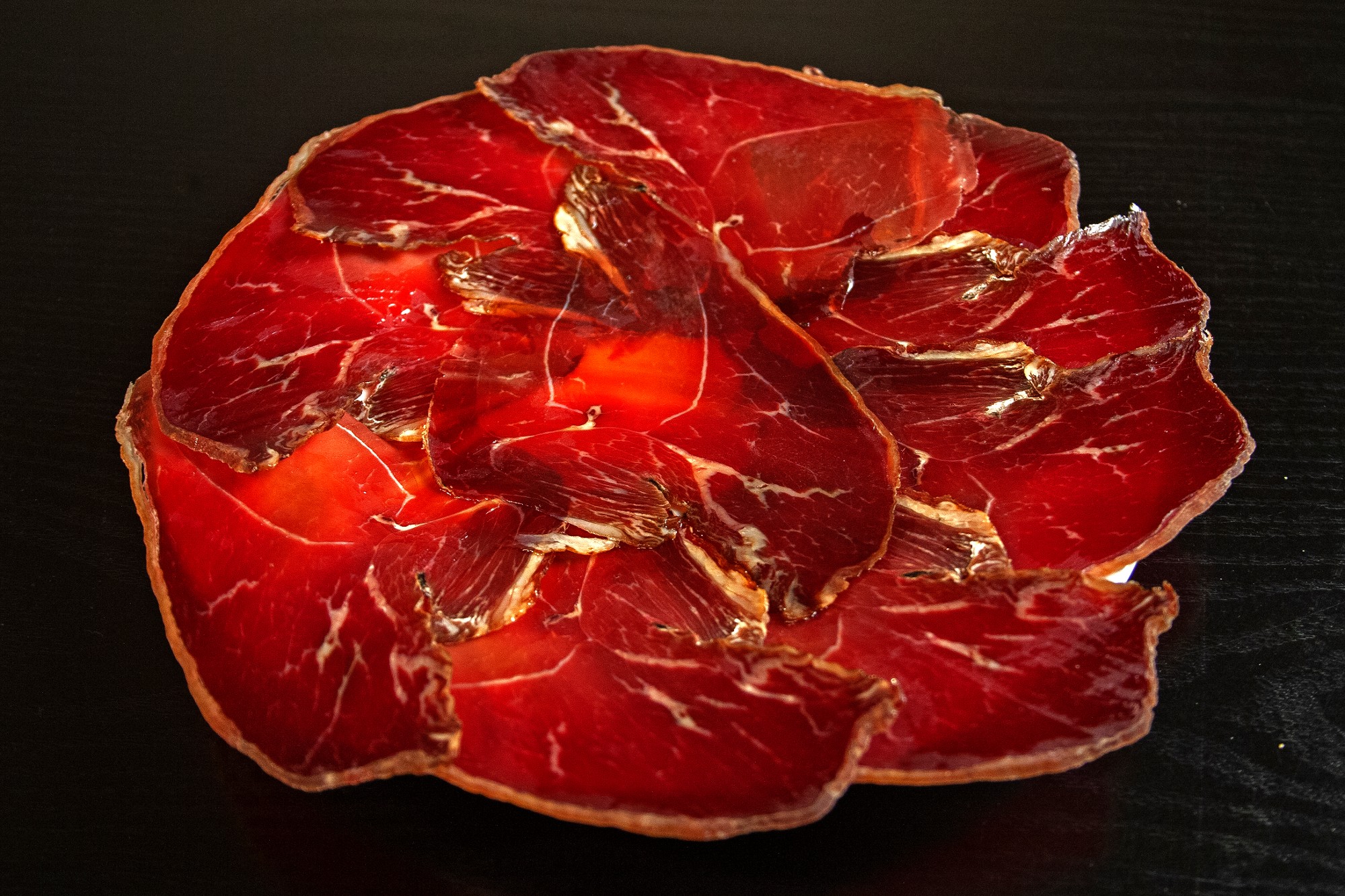 坐在餐桌旁享用户外饲养的肉类和传统香肠,品味独特的美味。