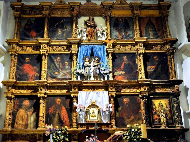Retablo renacentista de mediados del siglo XVI compuesto por tres cuerpos y cinco calles sobre sotabanco de fábrica y predela. Aunque la calle central de los primeros cuerpos ha sufrido algunas pérdidas, estas han quedado parcialmente restituidas con la inclusión de un sagrario en el primero y las esculturas exentas de factura moderna de los santos titulares del templo, los niños Justo y Pastor con la palma del martirio, en el segundo. Sobre ellos se sitúa una imagen de bulto redondo del siglo XVI de la Virgen María, mientras las calles laterales son ocupadas por óleos sobre lienzo que representan, desde el cuerpo inferior al superior, a los Padres de la Iglesia occidental o latina, los Evangelistas y diversos pasajes marianos.