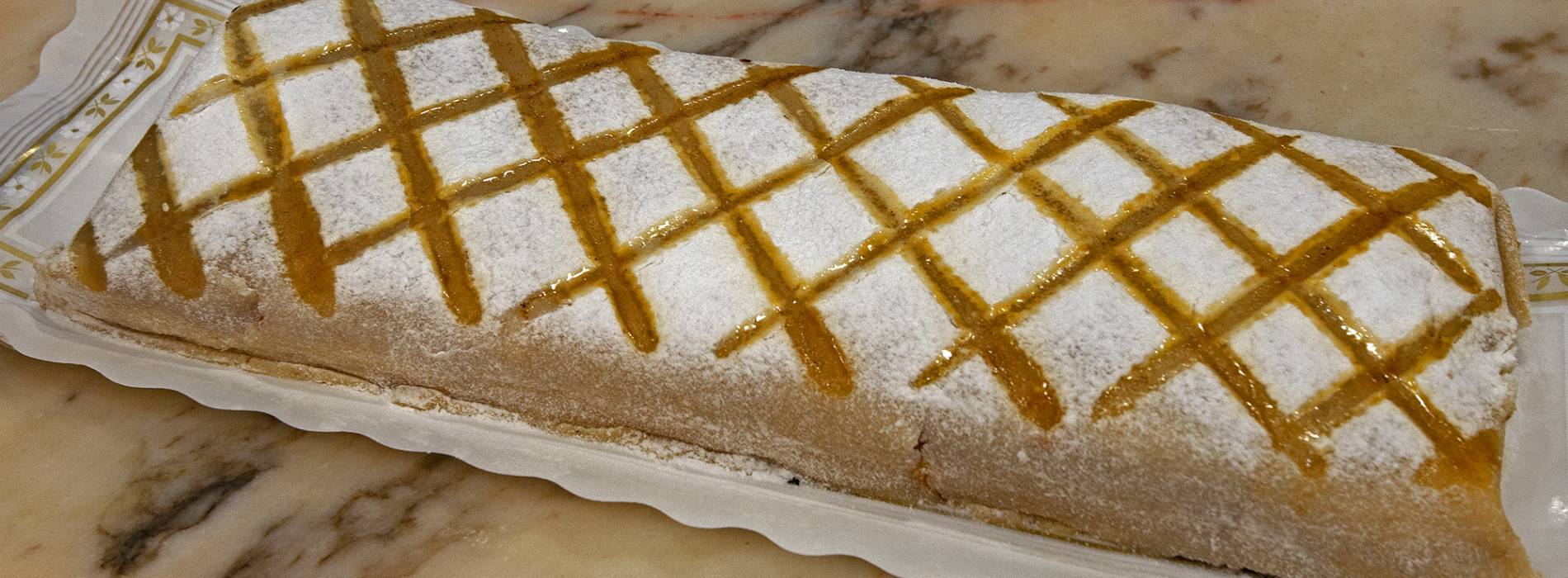 最后,为了制作蛋糕,将海绵蛋糕切成矩形,放上一层海绵蛋糕,上面先涂上糖浆(糖和水),然后放上一层蛋奶沙司,再撒上一点肉桂;然后再放上另一层海绵蛋糕,条件与前一层相同,即涂上糖浆。用这些层制作出最终的蛋糕后,在上面盖上一层薄薄的杏仁糖,并在上面撒上糖粉。用红铁装饰蛋糕。