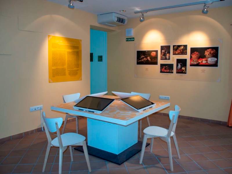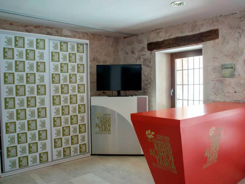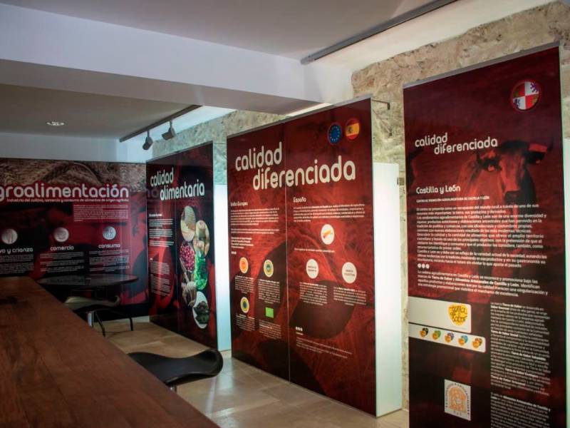 我们进入餐厅,那里有数字屏幕上的多媒体内容,展示了卡斯蒂利亚-莱昂各省的代表性产品信息。
