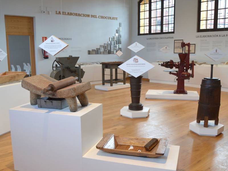 展示巧克力制作历史的仪器和物品:烤面包机、精炼机、滚筒、槽、研钵、模具以及十九世纪初机器的模型。