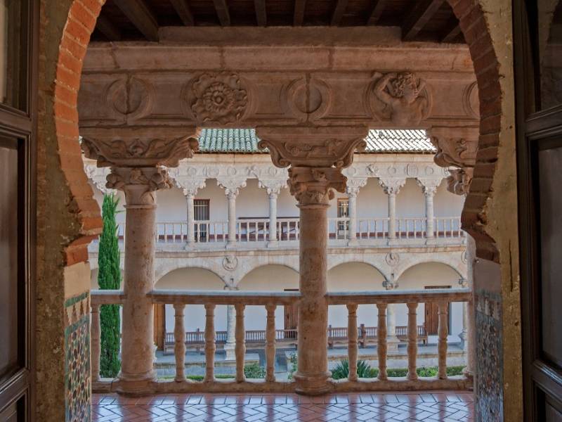 寺庙和外墙据信是由修士马丁·德·圣地亚哥设计的,他用千斤顶拱形凉廊完成了这座建筑,自然光通过带有半圆形拱门的大窗户照进来。回廊是修道院的亮点之一,因为它装饰华丽,雕刻精美。它呈五边形,分为两层。精致而极其美丽的雕塑装饰是阿隆索·贝鲁格特门徒的作品。该遗址以其丰富的建筑和精致的室内装饰而引人注目。